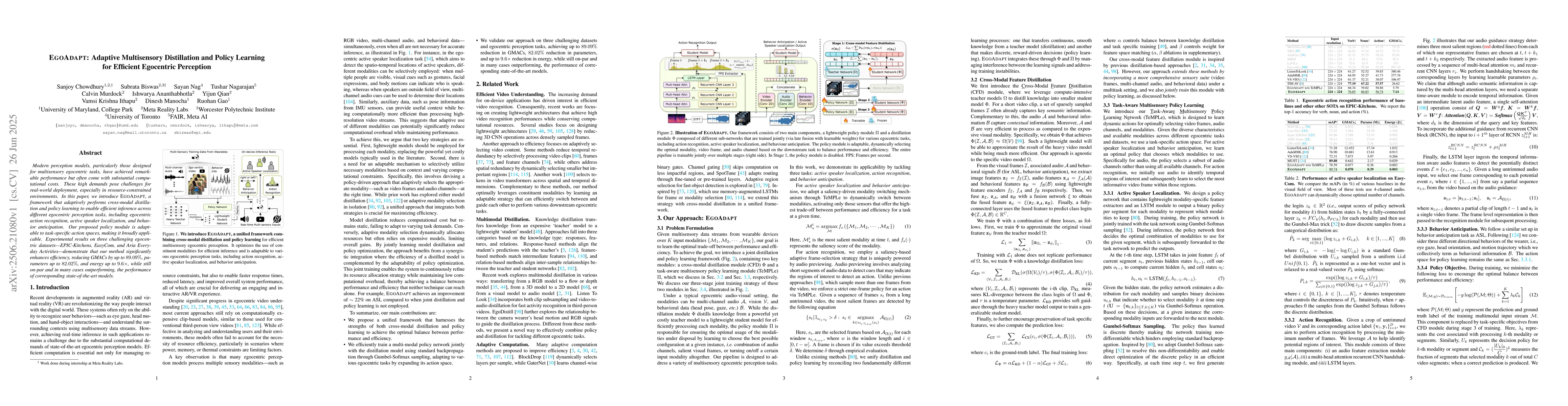 The paper introduces EgoAdapt, a framework for efficient egocentric perception tasks using adaptive cross-modal distillation and policy learning. It focuses on tasks like action recognition, active speaker localization, and behavior anticipation.