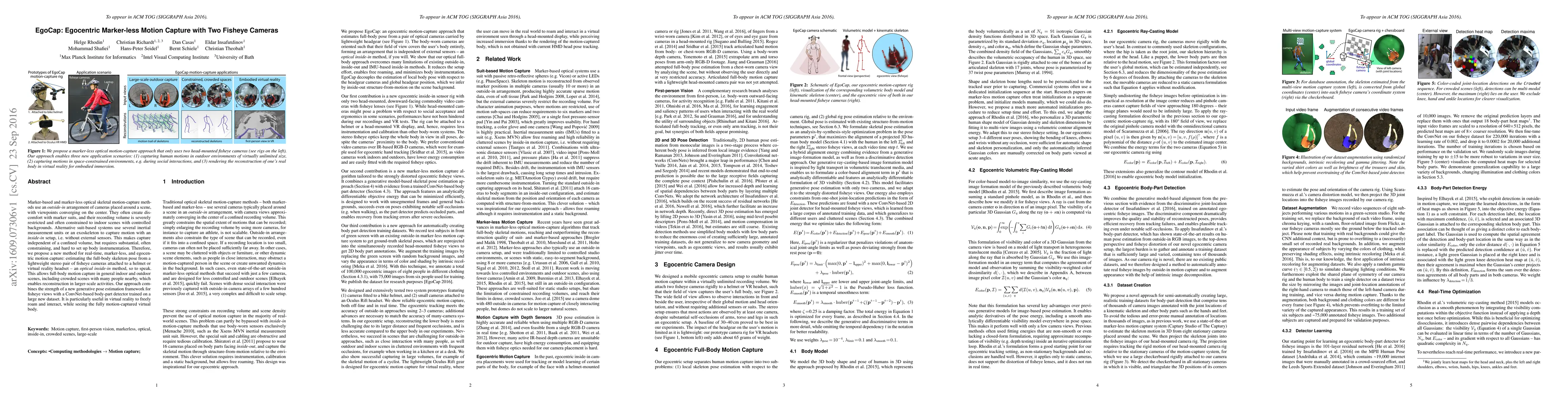 This paper proposes a novel marker-less motion capture method using two fisheye cameras attached to a helmet or VR headset to capture full-body skeleton poses in real-time. It leverages a generative pose estimation framework and a ConvNet-based body-part detector, enabling unrestricted movement in various indoor and outdoor environments.