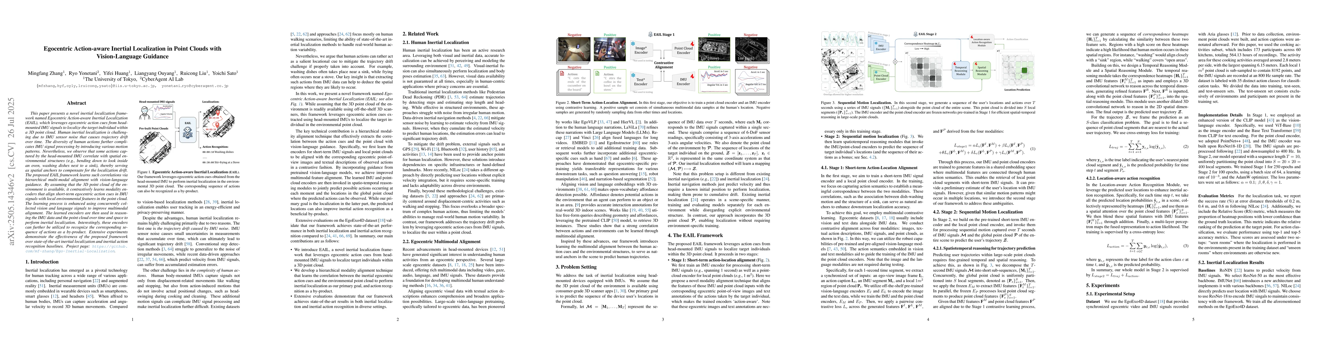 This paper presents a novel inertial localization framework named Egocentric Action-aware Inertial Localization (EAIL), which leverages egocentric action cues from head-mounted IMU signals to localize the target individual within a 3D point cloud. Human inertial localization is challenging due to IMU sensor noise that causes trajectory drift over time. The diversity of human actions further complicates IMU signal processing by introducing various motion patterns. Nevertheless, we observe that some actions captured by the head-mounted IMU correlate with spatial environmental structures (e.g., bending down to look inside an oven, washing dishes next to a sink), thereby serving as spatial anchors to compensate for the localization drift. The proposed EAIL framework learns such correlations via hierarchical multi-modal alignment with vision-language guidance. By assuming that the 3D point cloud of the environment is available, it contrastively learns modality encoders that align short-term egocentric action cues in IMU signals with local environmental features in the point cloud. The learning process is enhanced using concurrently collected vision and language signals to improve multimodal alignment. The learned encoders are then used in reasoning the IMU data and the point cloud over time and space to perform inertial localization. Interestingly, these encoders can further be utilized to recognize the corresponding sequence of actions as a by-product. Extensive experiments demonstrate the effectiveness of the proposed framework over state-of-the-art inertial localization and inertial action recognition baselines.
