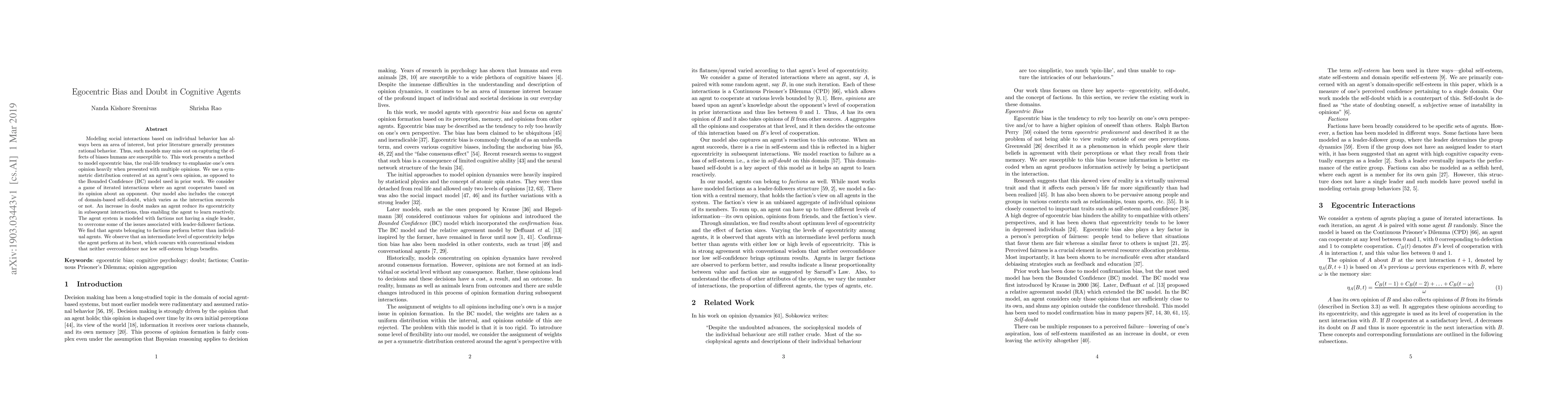Modeling social interactions based on individual behavior has always been an area of interest, but prior literature generally presumes rational behavior. Thus, such models may miss out on capturing the effects of biases humans are susceptible to. This work presents a method to model egocentric bias, the real-life tendency to emphasize one's own opinion heavily when presented with multiple opinions. We use a symmetric distribution centered at an agent's own opinion, as opposed to the Bounded Confidence (BC) model used in prior work. We consider a game of iterated interactions where an agent cooperates based on its opinion about an opponent. Our model also includes the concept of domain-based self-doubt, which varies as the interaction succeeds or not. An increase in doubt makes an agent reduce its egocentricity in subsequent interactions, thus enabling the agent to learn reactively. The agent system is modeled with factions not having a single leader, to overcome some of the issues associated with leader-follower factions. We find that agents belonging to factions perform better than individual agents. We observe that an intermediate level of egocentricity helps the agent perform at its best, which concurs with conventional wisdom that neither overconfidence nor low self-esteem brings benefits.