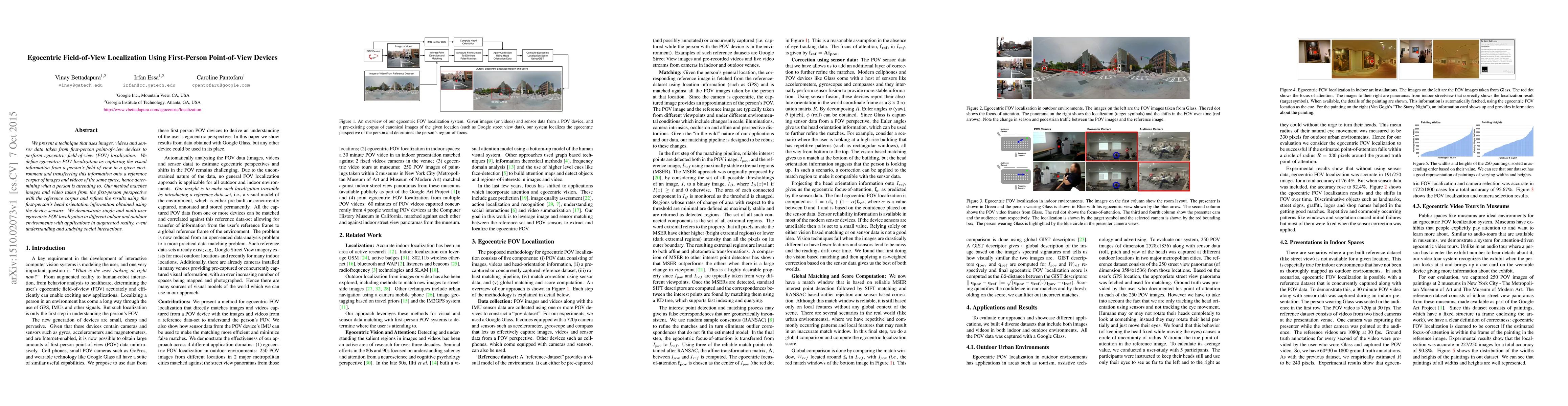This paper introduces a method for egocentric field-of-view localization using first-person point-of-view devices, matching user-captured images and videos with a reference corpus to determine attention. It leverages sensor data for head orientation and demonstrates applications in augmented reality and social interaction analysis.