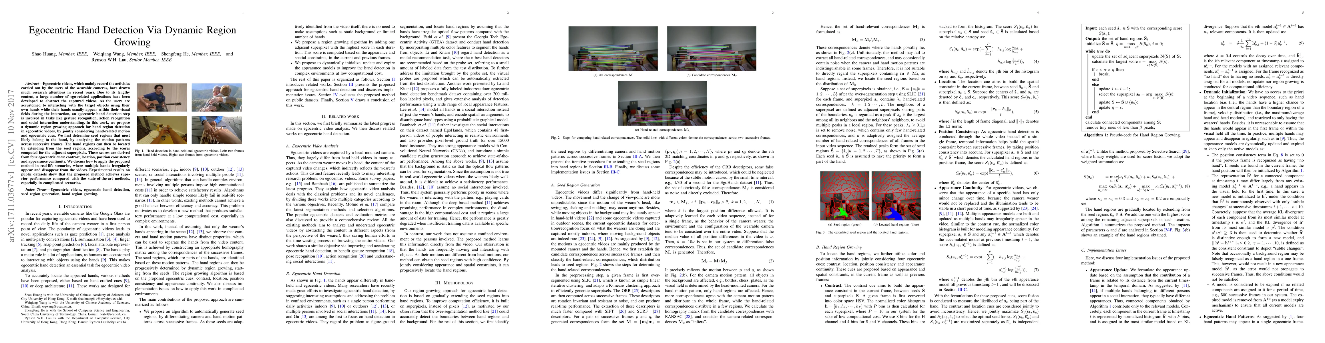This paper proposes a dynamic region growing method for detecting hands in egocentric videos, leveraging hand-related motion and egocentric cues to identify seed regions and extend them into hand regions based on contrast, location, position consistency, and appearance continuity. The method shows superior performance in real-life scenarios with complex hand appearances and disappearances.