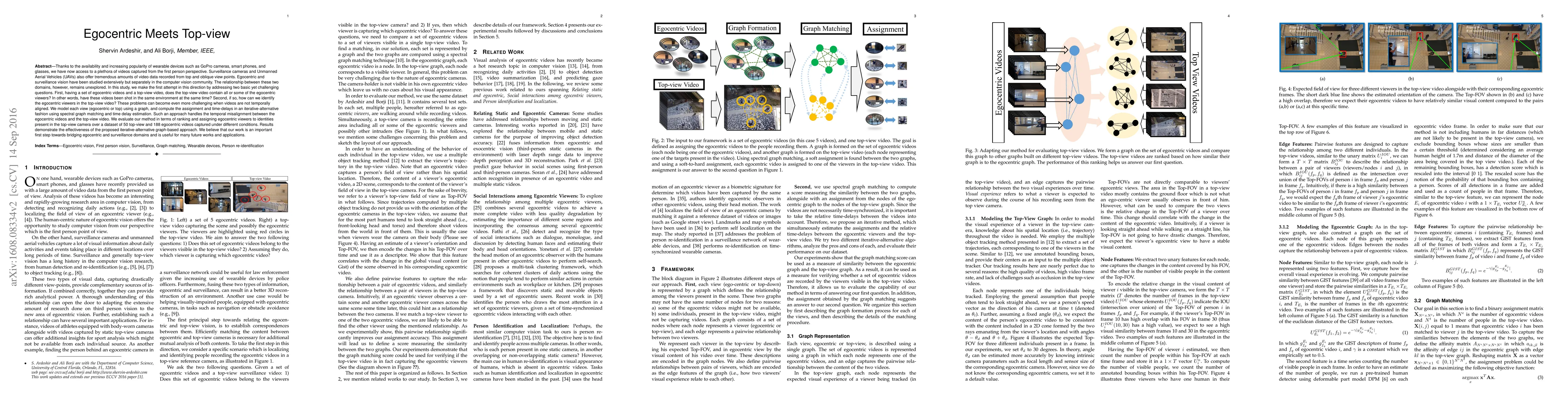 This paper explores the relationship between egocentric first-person perspective videos and top-view surveillance videos, aiming to verify if top-view footage contains individuals from egocentric footage and identify those individuals. It formulates the problem as a spectral graph matching instance to handle unknown time-delays, iteratively computing optimal assignments and time-delays to spatiotemporally localize egocentric observers in the top-view video.