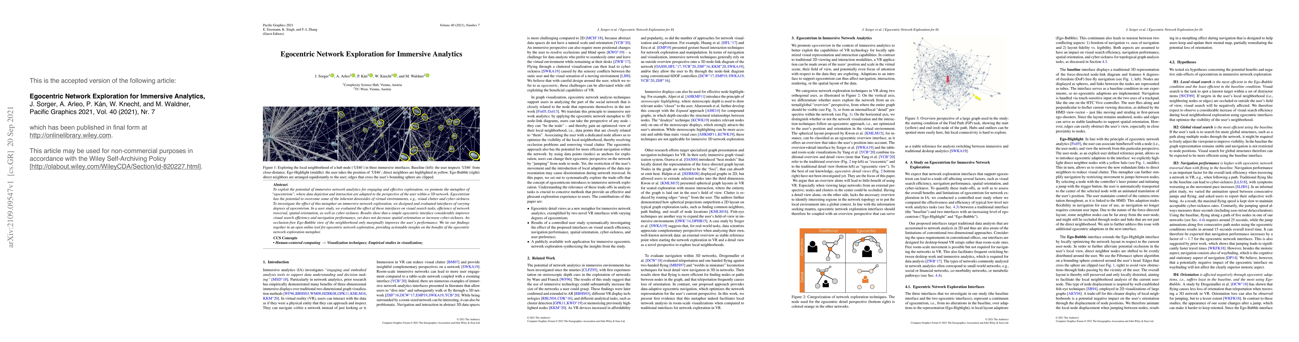 This research explores immersive analytics through an egocentric network exploration metaphor, demonstrating improved visual search and navigation efficiency without increasing cyber-sickness. An open online tool is provided to showcase the benefits of this approach.