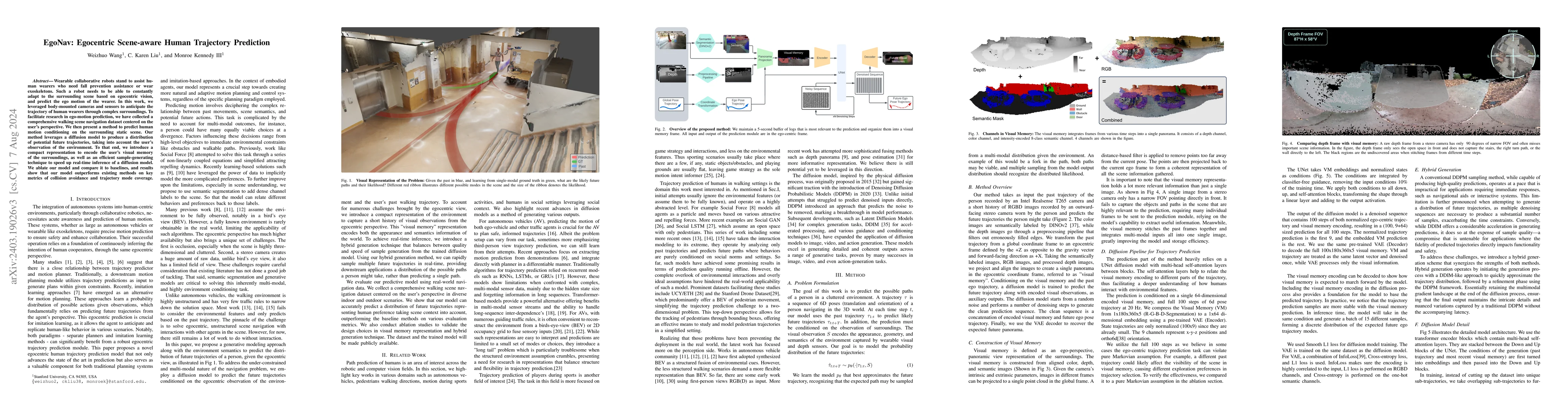 Wearable collaborative robots stand to assist human wearers who need fall prevention assistance or wear exoskeletons. Such a robot needs to be able to predict the ego motion of the wearer based on egocentric vision and the surrounding scene. In this work, we leveraged body-mounted cameras and sensors to anticipate the trajectory of human wearers through complex surroundings. To facilitate research in ego-motion prediction, we have collected a comprehensive walking scene navigation dataset centered on the user's perspective. We present a method to predict human motion conditioning on the surrounding static scene. Our method leverages a diffusion model to produce a distribution of potential future trajectories, taking into account the user's observation of the environment. We introduce a compact representation to encode the user's visual memory of the surroundings, as well as an efficient sample-generating technique to speed up real-time inference of a diffusion model. We ablate our model and compare it to baselines, and results show that our model outperforms existing methods on key metrics of collision avoidance and trajectory mode coverage.