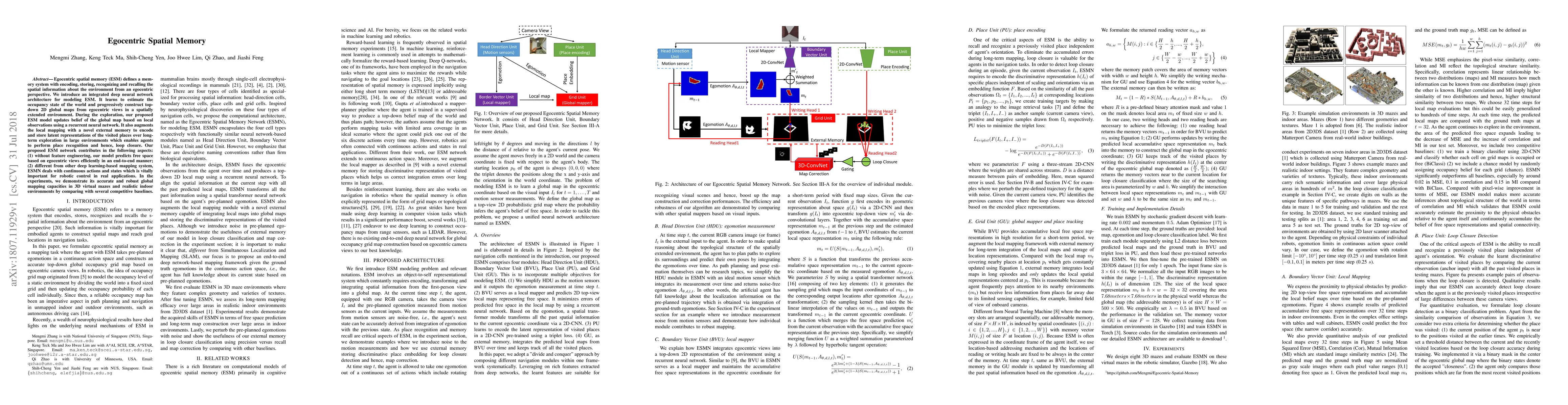 This paper proposes a deep neural network architecture for modeling egocentric spatial memory, enabling efficient occupancy state estimation and global map construction from egocentric views. The model uses a recurrent neural network and external memory for robust place recognition and loop closure in large environments.