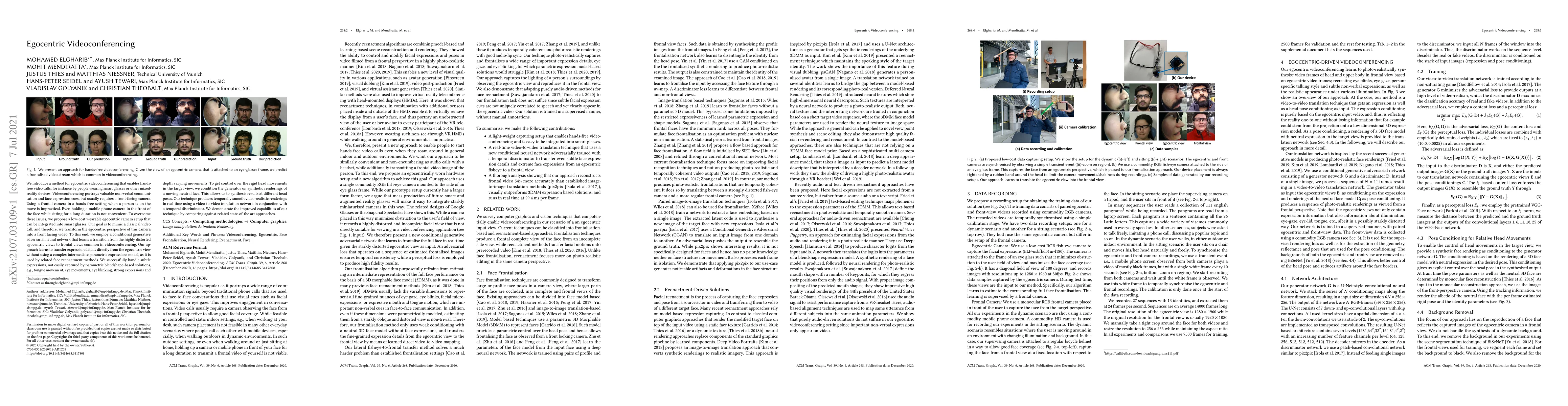 This paper proposes a method for hands-free egocentric videoconferencing using a low-cost wearable camera setup integrated into smart glasses. It employs a conditional generative adversarial network to transform egocentric views into frontal video calls, capturing subtle expressions and handling head movements effectively.
