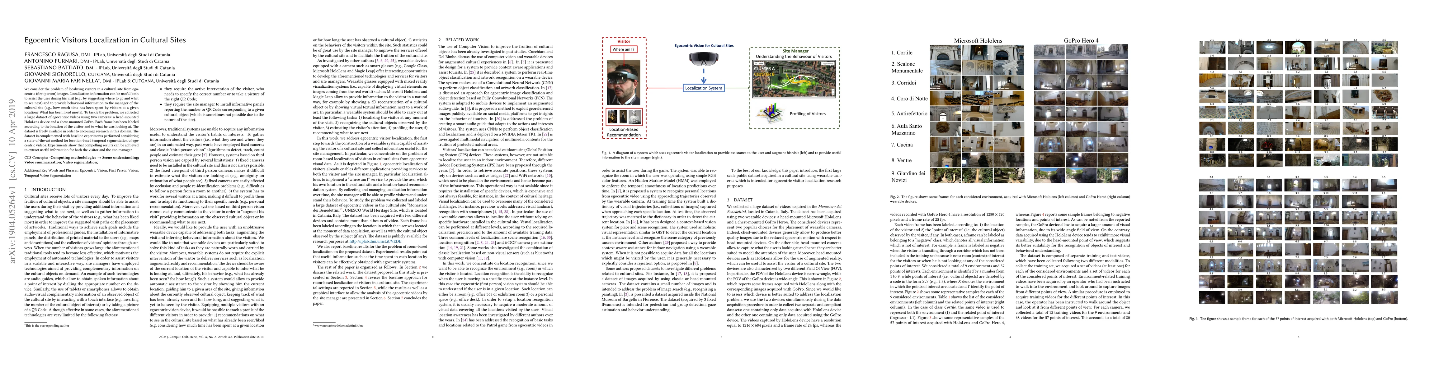 We consider the problem of localizing visitors in a cultural site from egocentric (first person) images. Localization information can be useful both to assist the user during his visit (e.g., by suggesting where to go and what to see next) and to provide behavioral information to the manager of the cultural site (e.g., how much time has been spent by visitors at a given location? What has been liked most?). To tackle the problem, we collected a large dataset of egocentric videos using two cameras: a head-mounted HoloLens device and a chest-mounted GoPro. Each frame has been labeled according to the location of the visitor and to what he was looking at. The dataset is freely available in order to encourage research in this domain. The dataset is complemented with baseline experiments performed considering a state-of-the-art method for location-based temporal segmentation of egocentric videos. Experiments show that compelling results can be achieved to extract useful information for both the visitor and the site-manager.