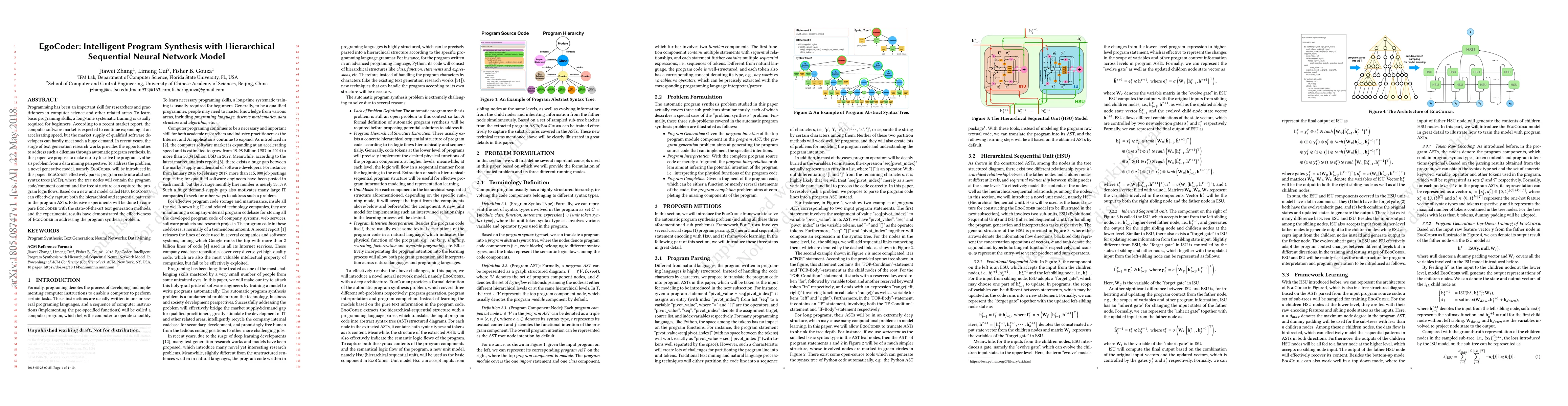 EgoCoder is a novel generative model for intelligent program synthesis that parses code into abstract syntax trees (ASTs) to capture hierarchical and sequential patterns. It outperforms state-of-the-art text generation methods in automatic program synthesis, addressing the growing demand for software developers.