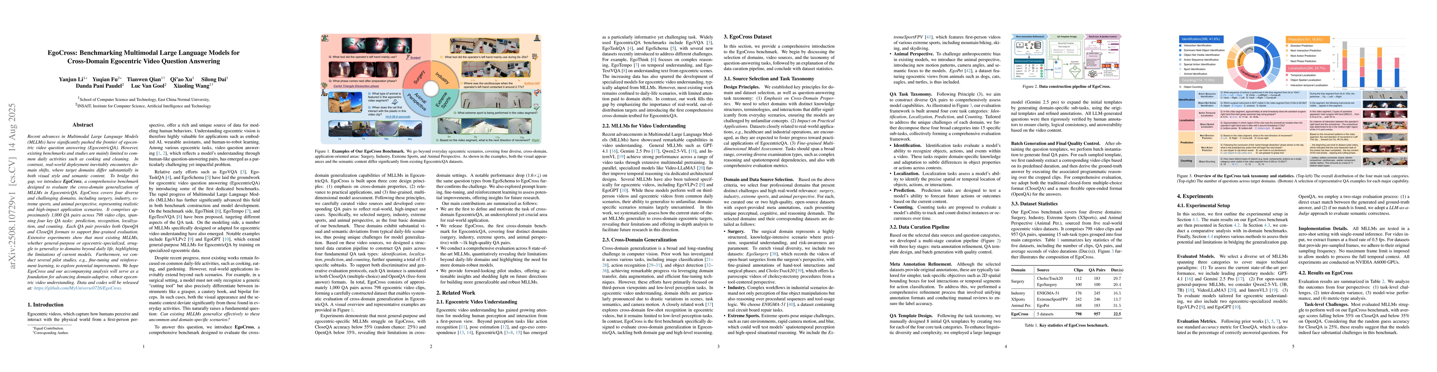 Recent advances in Multimodal Large Language Models (MLLMs) have significantly pushed the frontier of egocentric video question answering (EgocentricQA). However, existing benchmarks and studies are mainly limited to common daily activities such as cooking and cleaning. In contrast, real-world deployment inevitably encounters domain shifts, where target domains differ substantially in both visual style and semantic content. To bridge this gap, we introduce \textbf{EgoCross}, a comprehensive benchmark designed to evaluate the cross-domain generalization of MLLMs in EgocentricQA. EgoCross covers four diverse and challenging domains, including surgery, industry, extreme sports, and animal perspective, representing realistic and high-impact application scenarios. It comprises approximately 1,000 QA pairs across 798 video clips, spanning four key QA tasks: prediction, recognition, localization, and counting. Each QA pair provides both OpenQA and CloseQA formats to support fine-grained evaluation. Extensive experiments show that most existing MLLMs, whether general-purpose or egocentric-specialized, struggle to generalize to domains beyond daily life, highlighting the limitations of current models. Furthermore, we conduct several pilot studies, \eg, fine-tuning and reinforcement learning, to explore potential improvements. We hope EgoCross and our accompanying analysis will serve as a foundation for advancing domain-adaptive, robust egocentric video understanding. Data and codes will be released at: \href{https://github.com/MyUniverse0726/EgoCross}{https://github.com/MyUniverse0726/EgoCross.}