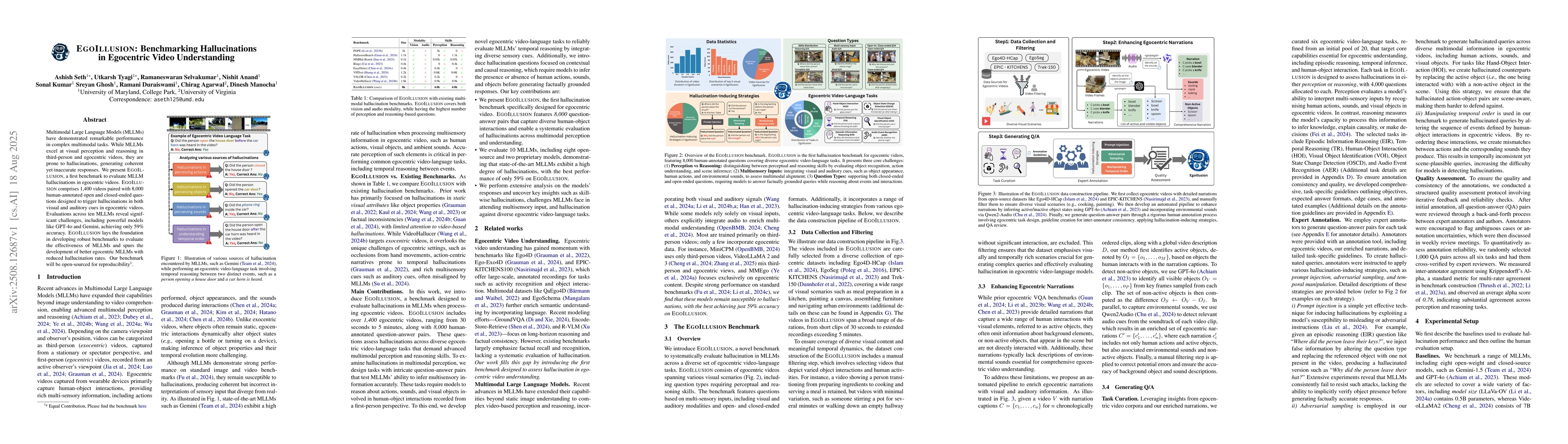 Multimodal Large Language Models (MLLMs) have demonstrated remarkable performance in complex multimodal tasks. While MLLMs excel at visual perception and reasoning in third-person and egocentric videos, they are prone to hallucinations, generating coherent yet inaccurate responses. We present EgoIllusion, a first benchmark to evaluate MLLM hallucinations in egocentric videos. EgoIllusion comprises 1,400 videos paired with 8,000 human-annotated open and closed-ended questions designed to trigger hallucinations in both visual and auditory cues in egocentric videos. Evaluations across ten MLLMs reveal significant challenges, including powerful models like GPT-4o and Gemini, achieving only 59% accuracy. EgoIllusion lays the foundation in developing robust benchmarks to evaluate the effectiveness of MLLMs and spurs the development of better egocentric MLLMs with reduced hallucination rates. Our benchmark will be open-sourced for reproducibility.