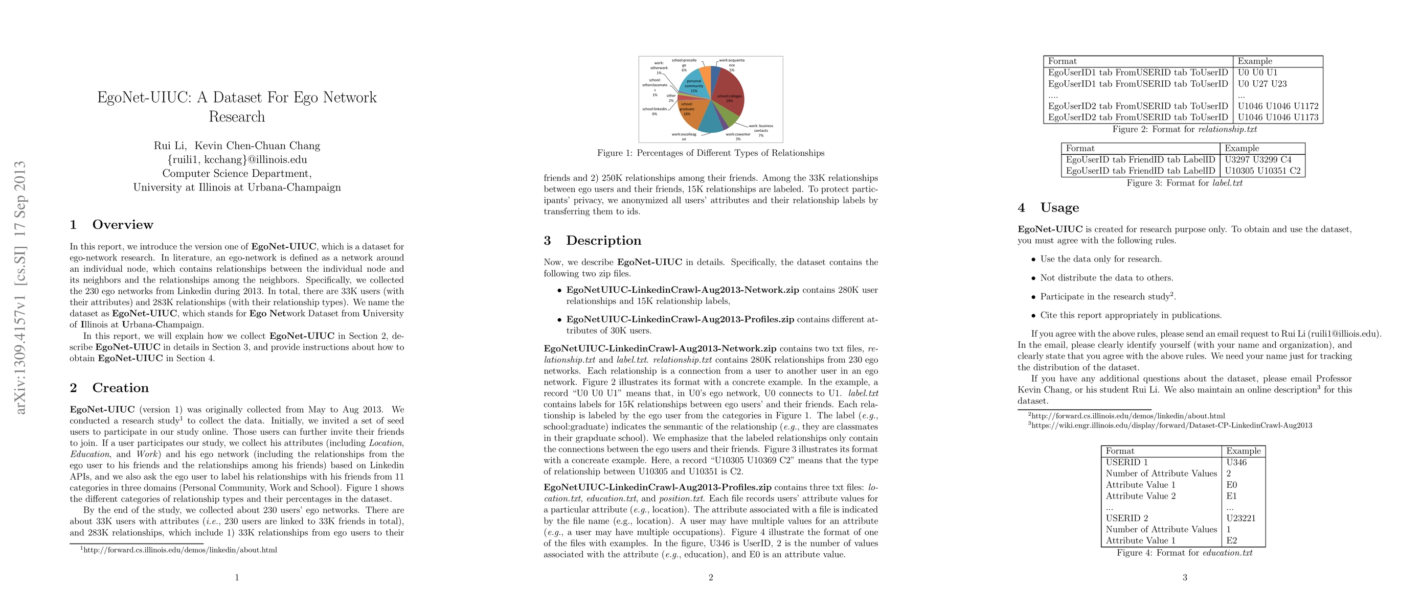 Summary: EgoNet-UIUC is a dataset for ego network research containing 230 ego networks from LinkedIn, encompassing 33,000 users and 283,000 relationships, aimed at facilitating studies in social network analysis.