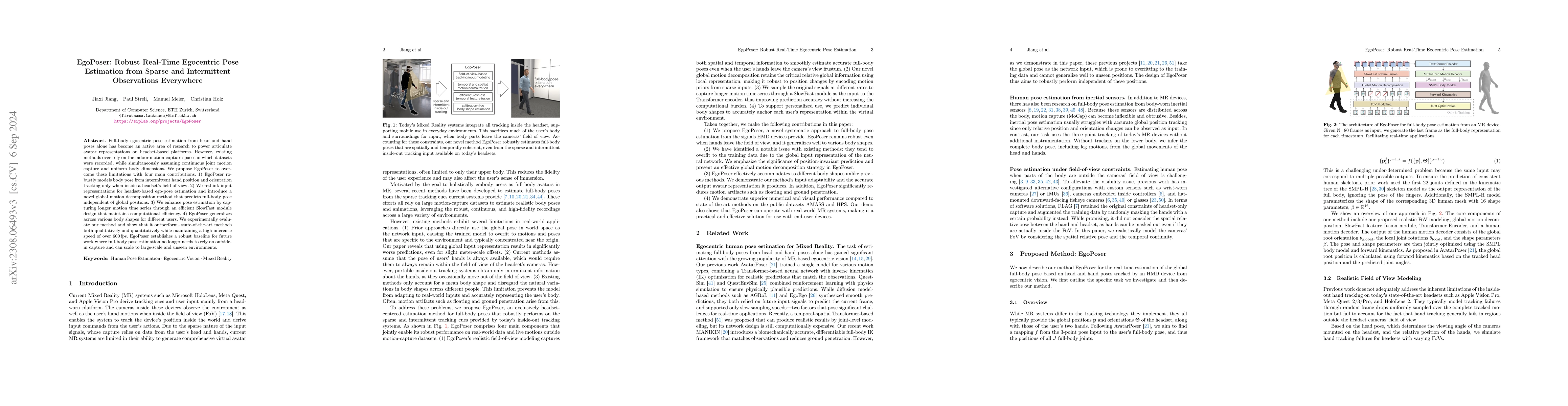 EgoPoser proposes a novel method for real-time full-body ego-pose estimation from head and hand poses, overcoming the limitations of existing methods by using a novel motion decomposition and robustly modeling pose from intermittent tracking, while generalizing across different body sizes. The method achieves superior performance and high inference speed, establishing a robust baseline for large-scene environments.