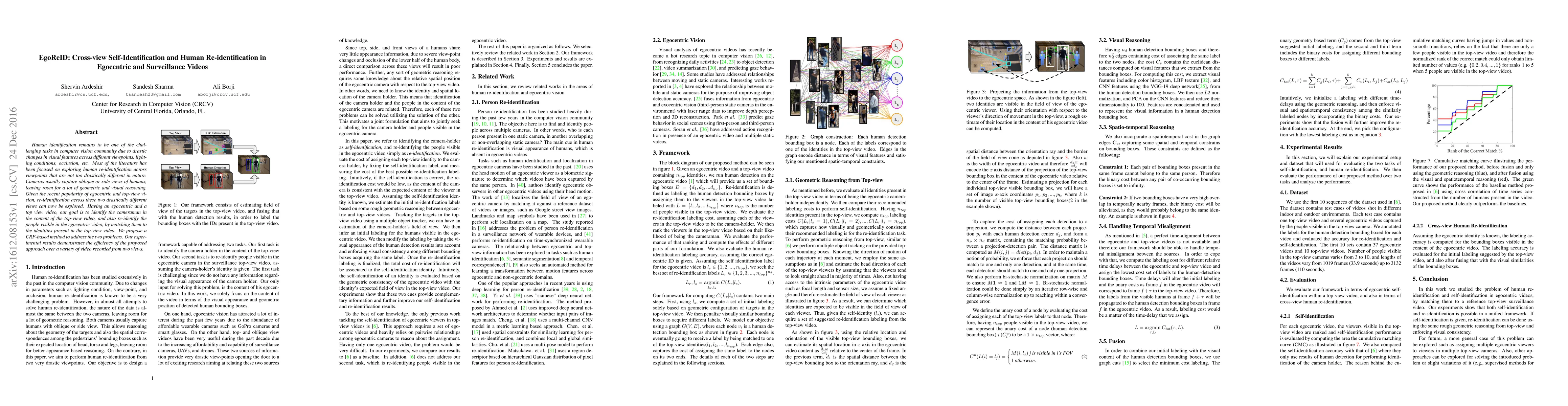The paper proposes a CRF-based method for identifying and re-identifying individuals in egocentric and surveillance videos, addressing the challenge of drastically different viewpoints. Experimental results show the effectiveness of the approach in matching identities across these views.
