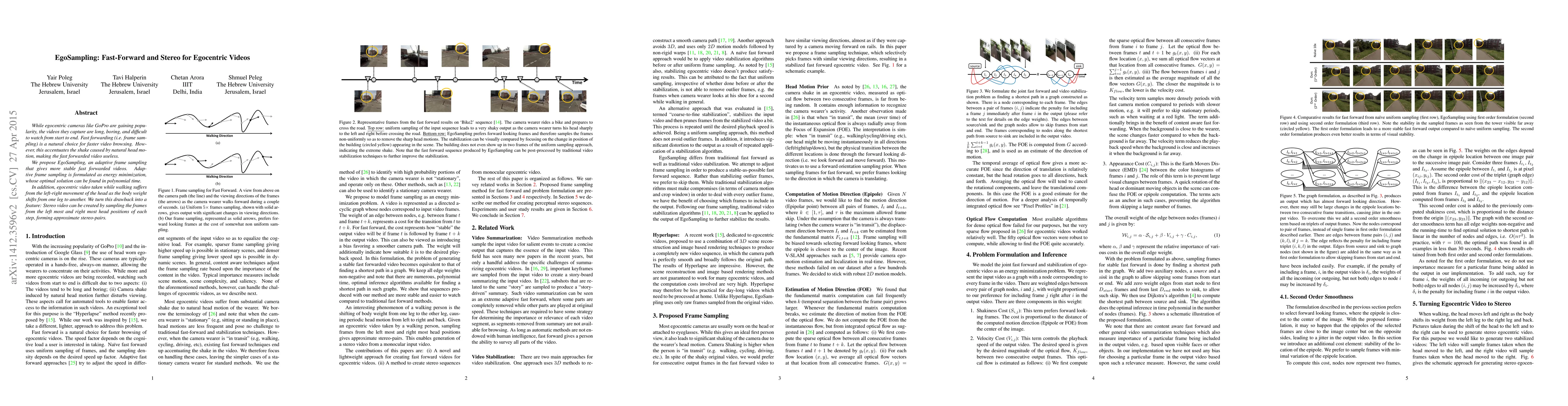Summary: EgoSampling proposes an adaptive frame sampling method to create stable fast-forwarded egocentric videos, minimizing shake from head motion. Additionally, it leverages head movement during walking to generate stereo-pairs from left and right head positions, enhancing the viewing experience.