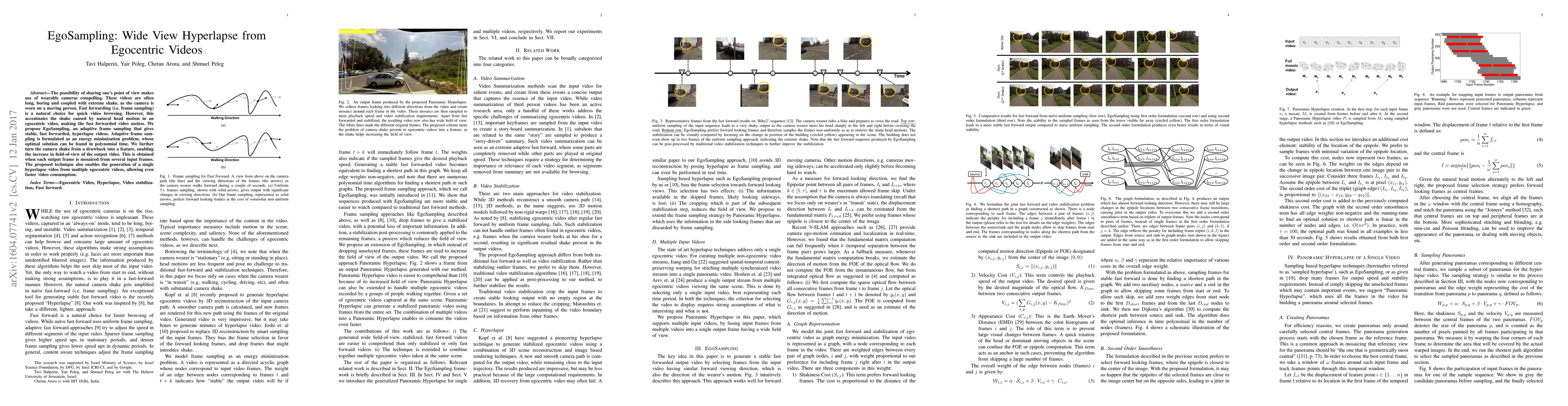 EgoSampling proposes an adaptive frame sampling method to create stable, fast-forwarded hyperlapse videos from long, shaky egocentric videos. This method transforms camera shake into a feature, enhancing the field-of-view by mosaicing multiple input frames into each output frame, and can merge multiple videos to facilitate faster video consumption.