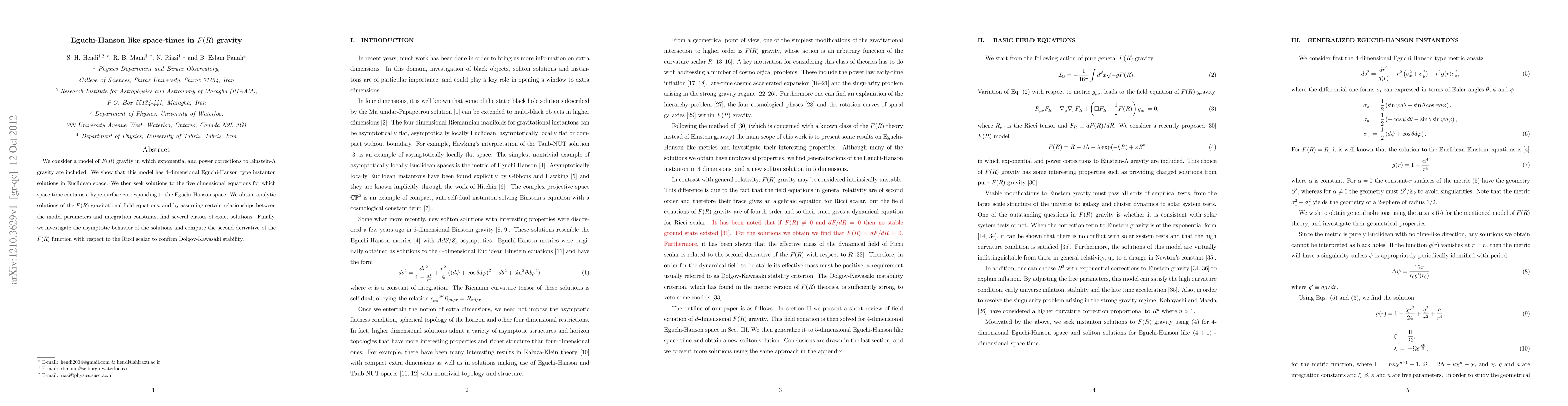 This paper explores $F(R)$ gravity with exponential and power corrections, discovering 4D Eguchi-Hanson type solutions and extending these to five-dimensional space-times. It presents analytic solutions for these gravitational field equations, analyzes their stability, and computes the second derivative of the $F(R)$ function for stability confirmation.