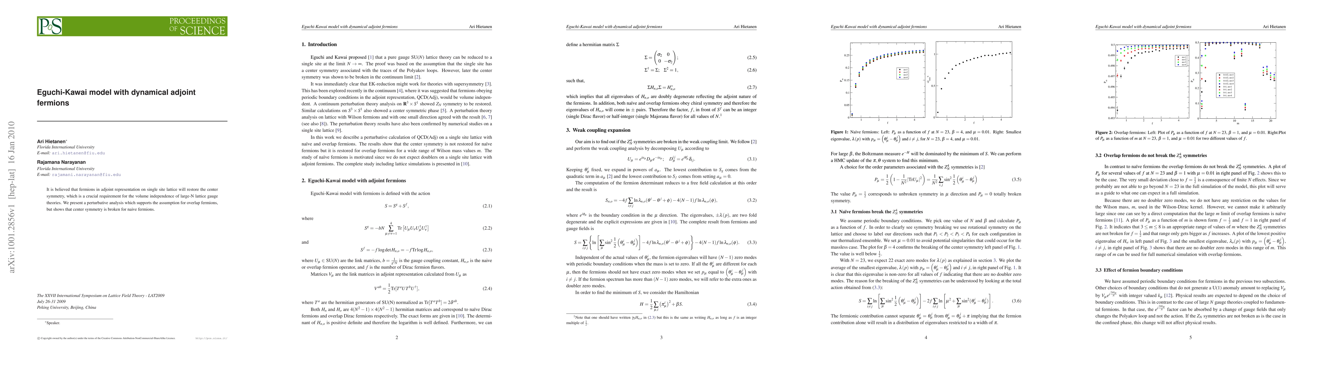 It is believed that fermions in adjoint representation on single site lattice will restore the center symmetry, which is a crucial requirement for the volume independence of large-N lattice gauge theories. We present a perturbative analysis which supports the assumption for overlap fermions, but shows that center symmetry is broken for naive fermions.