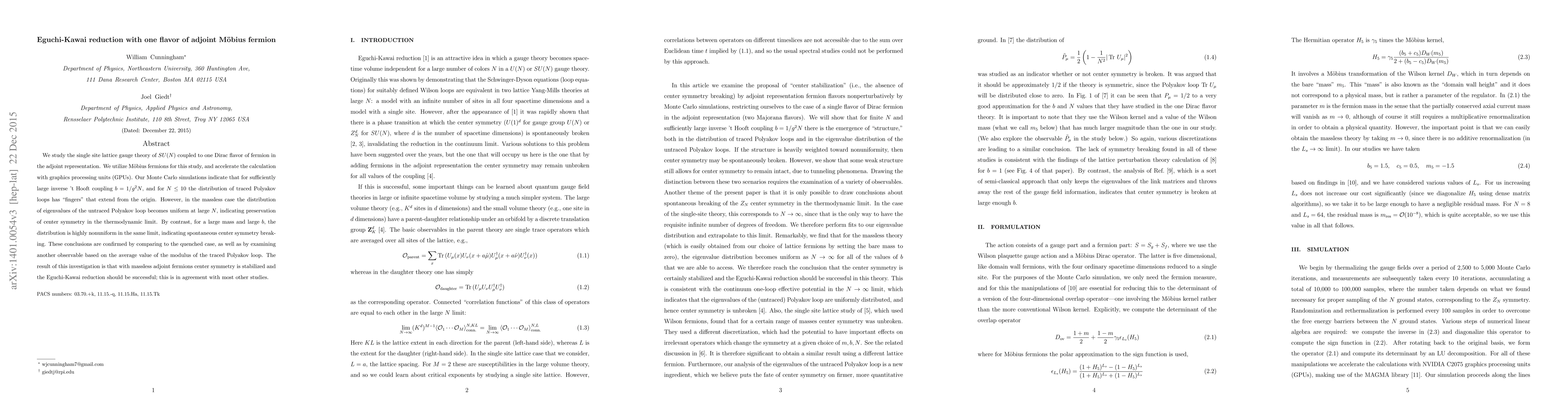 We study the single site lattice gauge theory of SU(N) coupled to one Dirac flavor of fermion in the adjoint representation. We utilize M\"obius fermions for this study, and accelerate the calculation with graphics processing units (GPUs). Our Monte Carlo simulations indicate that for sufficiently large inverse 't Hooft coupling b = 1/g^2 N, and for N \leq 10 the distribution of traced Polyakov loops has "fingers" that extend from the origin. However, in the massless case the distribution of eigenvalues of the untraced Polyakov loop becomes uniform at large N, indicating preservation of center symmetry in the thermodynamic limit. By contrast, for a large mass and large b, the distribution is highly nonuniform in the same limit, indicating spontaneous center symmetry breaking. These conclusions are confirmed by comparing to the quenched case, as well as by examining another observable based on the average value of the modulus of the traced Polyakov loop. The result of this investigation is that with massless adjoint fermions center symmetry is stabilized and the Eguchi-Kawai reduction should be successful; this is in agreement with most other studies.