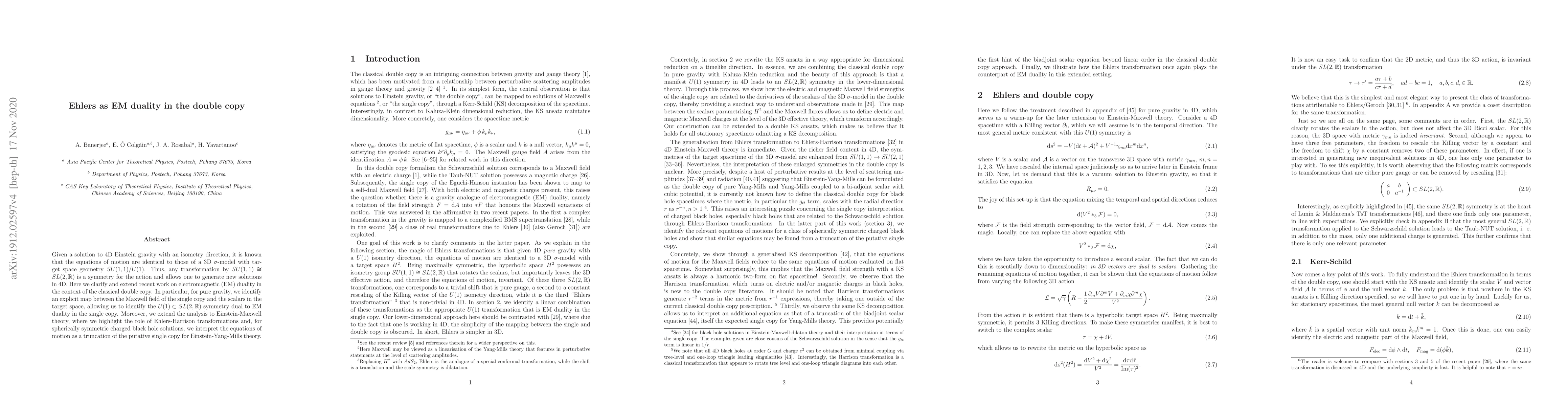 Given a solution to 4D Einstein gravity with an isometry direction, it is known that the equations of motion are identical to those of a 3D $\sigma$-model with target space geometry $SU(1,1)/U(1)$. Thus, any transformation by $SU(1, 1) \cong SL(2,\mathbb{R})$ is a symmetry for the action and allows one to generate new solutions in 4D. Here we clarify and extend recent work on electromagnetic (EM) duality in the context of the classical double copy. In particular, for pure gravity, we identify an explicit map between the Maxwell field of the single copy and the scalars in the target space, allowing us to identify the $U(1) \subset SL(2, \mathbb{R})$ symmetry dual to EM duality in the single copy. Moreover, we extend the analysis to Einstein-Maxwell theory, where we highlight the role of Ehlers-Harrison transformations and, for spherically symmetric charged black hole solutions, we interpret the equations of motion as a truncation of the putative single copy for Einstein-Yang-Mills theory.