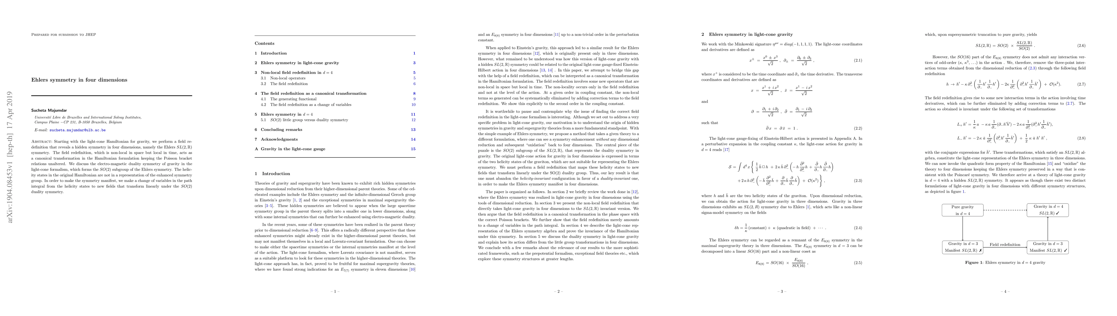 Starting with the light-cone Hamiltonian for gravity, we perform a field redefinition that reveals a hidden symmetry in four dimensions, namely the Ehlers $SL(2,R)$ symmetry. The field redefinition, which is non-local in space but local in time, acts as a canonical transformation in the Hamiltonian formulation keeping the Poisson bracket relations unaltered. We discuss the electro-magnetic duality symmetry of gravity in the light-cone formalism, which forms the $SO(2)$ subgroup of the Ehlers symmetry. The helicity states in the original Hamiltonian are not in a representation of the enhanced symmetry group. In order to make the symmetry manifest, we make a change of variables in the path integral from the helicity states to new fields that transform linearly under the $SO(2)$ duality symmetry.