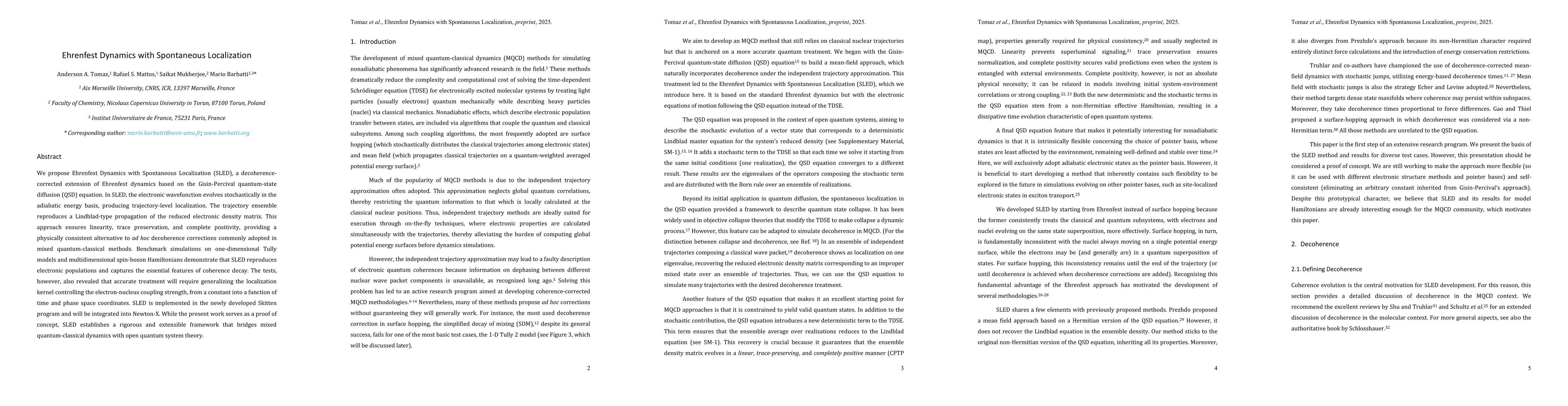 We propose Ehrenfest Dynamics with Spontaneous Localization (SLED), a decoherence-corrected extension of Ehrenfest dynamics based on the Gisin-Percival quantum-state diffusion (QSD) equation. In SLED, the electronic wavefunction evolves stochastically in the adiabatic energy basis, producing trajectory-level localization. The trajectory ensemble reproduces a Lindblad-type propagation of the reduced electronic density matrix. This approach ensures linearity, trace preservation, and complete positivity, providing a physically consistent alternative to ad hoc decoherence corrections commonly adopted in mixed quantum-classical methods. Benchmark simulations on one-dimensional Tully models and multidimensional spin-boson Hamiltonians demonstrate that SLED reproduces electronic populations and captures the essential features of coherence decay. The tests, however, also revealed that accurate treatment will require generalizing the localization kernel controlling the electron-nucleus coupling strength, from a constant into a function of time and phase space coordinates. SLED is implemented in the newly developed Skitten program and will be integrated into Newton-X. While the present work serves as a proof of concept, SLED establishes a rigorous and extensible framework that bridges mixed quantum-classical dynamics with open quantum system theory.