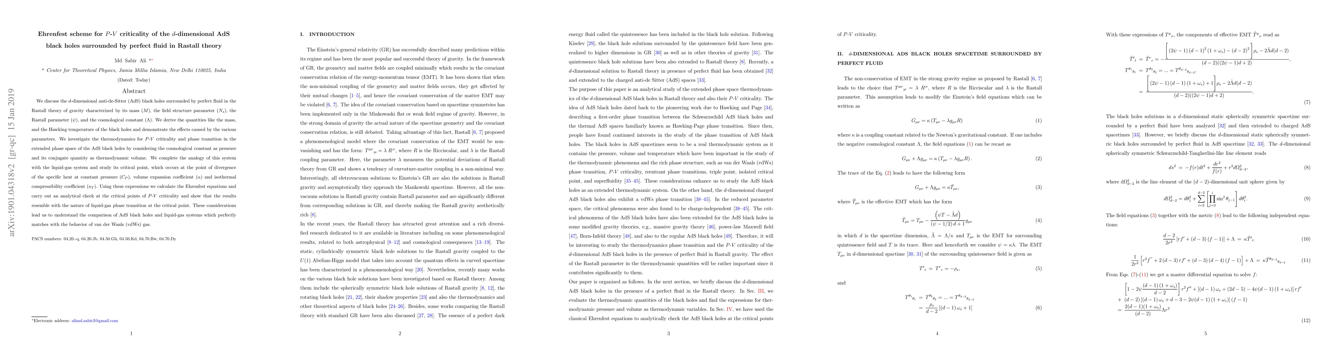 The paper presents a detailed analysis of the thermodynamic properties of d-dimensional AdS black holes in Rastall gravity, including the derivation of Ehrenfest equations and the PD ratio, thereby establishing a classical analogy with the van der Waals fluid.
