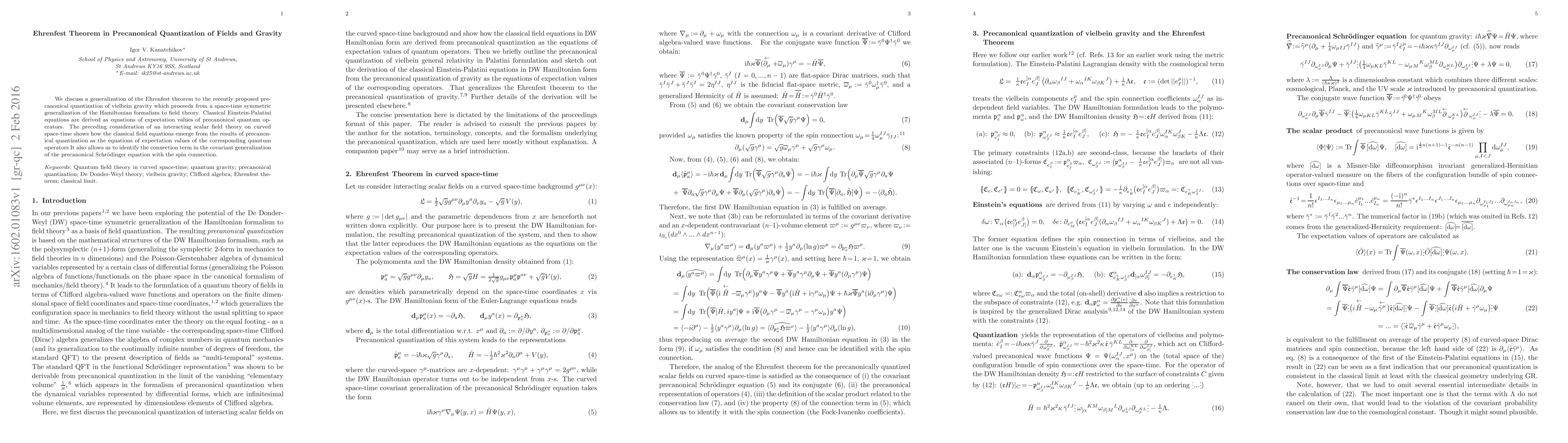 We discuss a generalization of the Ehrenfest theorem to the recently proposed precanonical quantization of vielbein gravity which proceeds from a space-time symmetric generalization of the Hamiltonian formalism to field theory. Classical Einstein-Palatini equations are derived as equations of expectation values of precanonical quantum operators. The preceding consideration of an interacting scalar field theory on curved space-time shows how the classical field equations emerge from the results of precanonical quantization as the equations of expectation values of the corresponding quantum operators. It also allows us to identify the connection term in the covariant generalization of the precanonical Schr\"odinger equation with the spin connection.