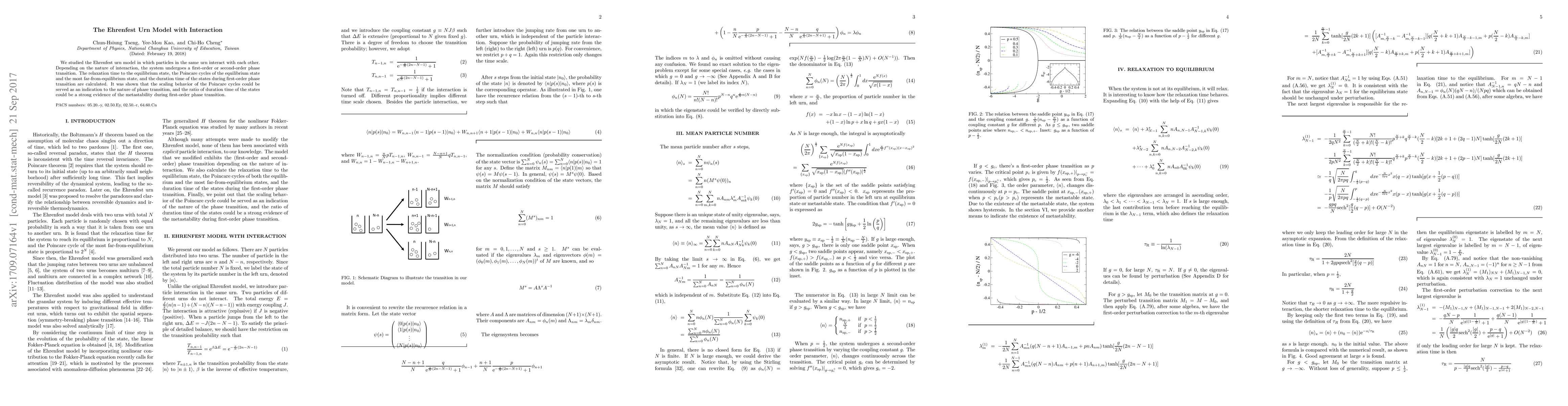 We studied the Ehrenfest urn model in which particles in the same urn interact with each other. Depending on the nature of interaction, the system undergoes a first-order or second-order phase transition. The relaxation time to the equilibrium state, the Poincare cycles of the equilibrium state and the most far-from-equilibrium state, and the duration time of the states during first-order phase transition are calculated. It was shown that the scaling behavior of the Poincare cycles could be served as an indication to the nature of phase transition, and the ratio of duration time of the states could be a strong evidence of the metastability during first-order phase transition.