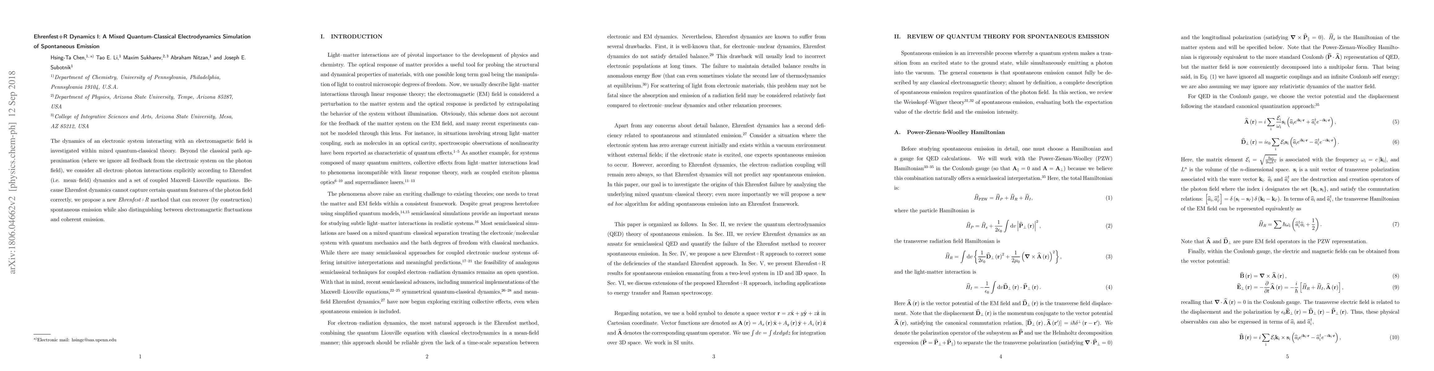 The dynamics of an electronic system interacting with an electromagnetic field is investigated within mixed quantum-classical theory. Beyond the classical path approximation (where we ignore all feedback from the electronic system on the photon field), we consider all electron-photon interactions explicitly according to Ehrenfest (i.e. mean-field) dynamics and a set of coupled Maxwell-Liouville equations. Because Ehrenfest dynamics cannot capture certain quantum features of the photon field correctly, we propose a new Ehrenfest+R method that can recover (by construction) spontaneous emission while also distinguishing between electromagnetic fluctuations and coherent emission.