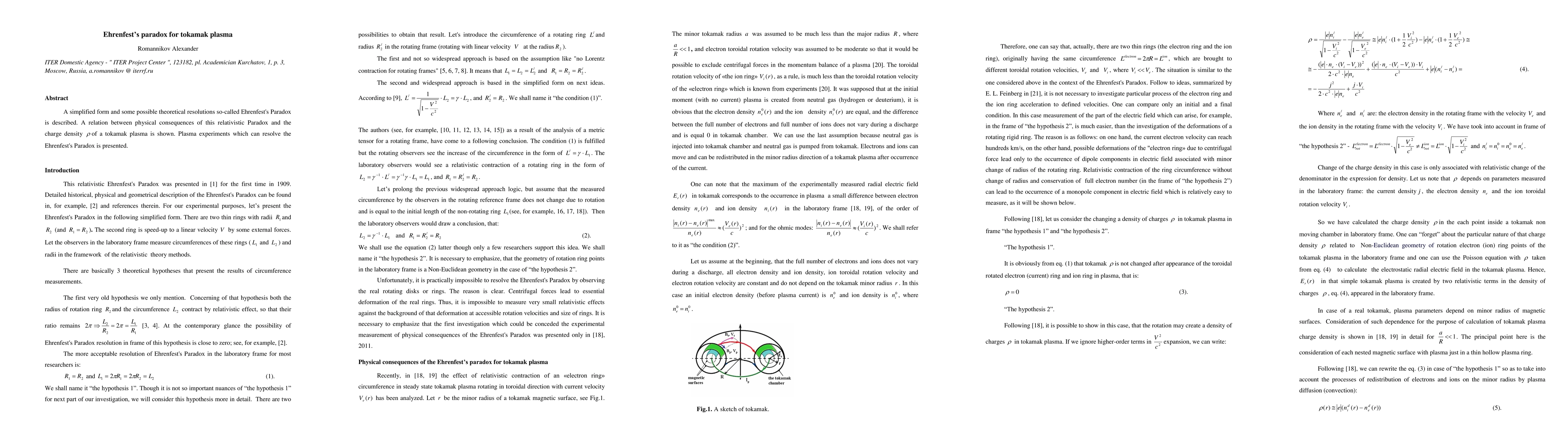 Ehrenfest's Paradox in tokamak plasma is examined, linking its relativistic effects to charge density. Proposed experiments aim to resolve this paradox by observing its physical consequences in plasma.