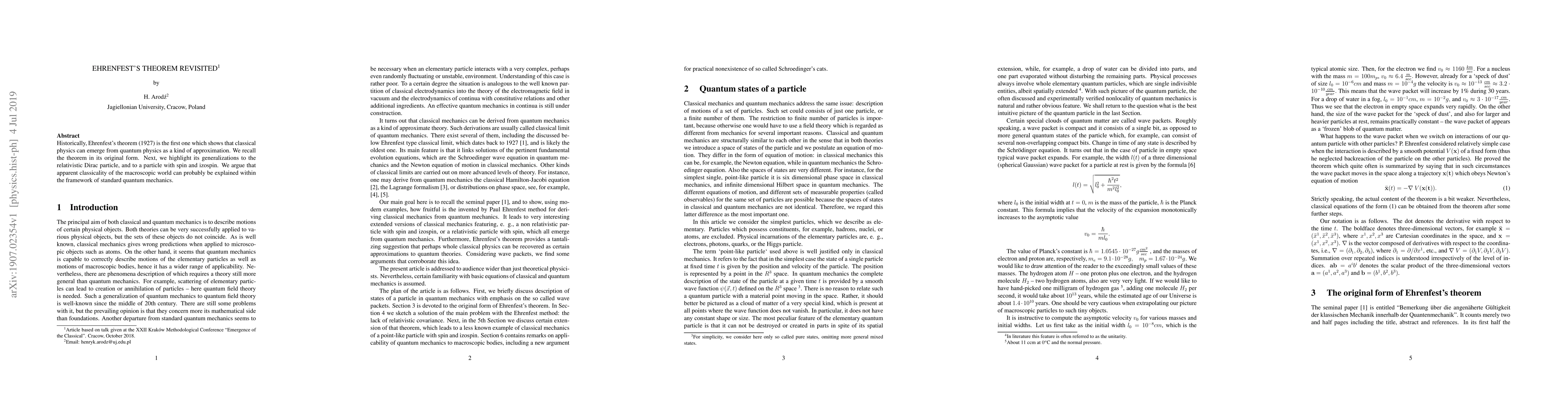 Ehrenfest's theorem demonstrates how classical physics emerges from quantum mechanics as an approximation. Its generalizations extend to relativistic particles and those with spin and isospin, suggesting that standard quantum mechanics can explain the apparent classicality of the macroscopic world.