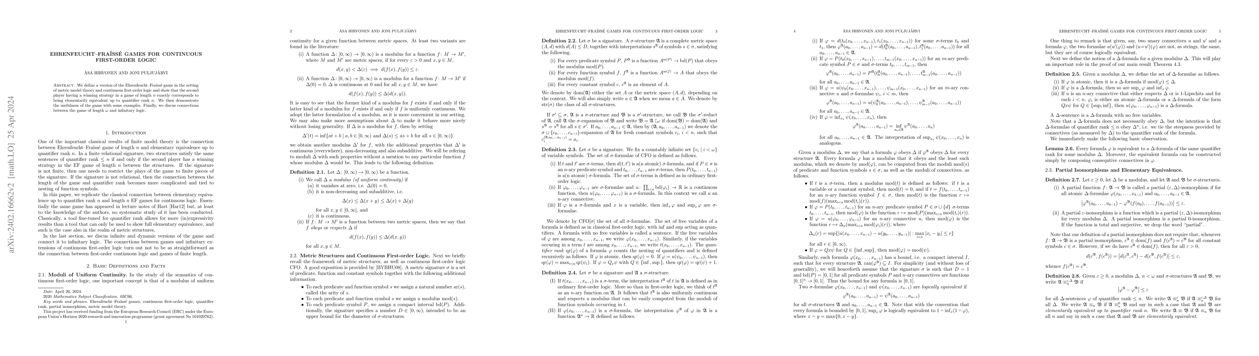 The paper introduces Ehrenfeucht-Fraissé games within continuous first-order logic and metric model theory, showing that a second player's winning strategy at length $n$ indicates elementary equivalence up to quantifier rank $n$, and explores connections to infinitary logic.