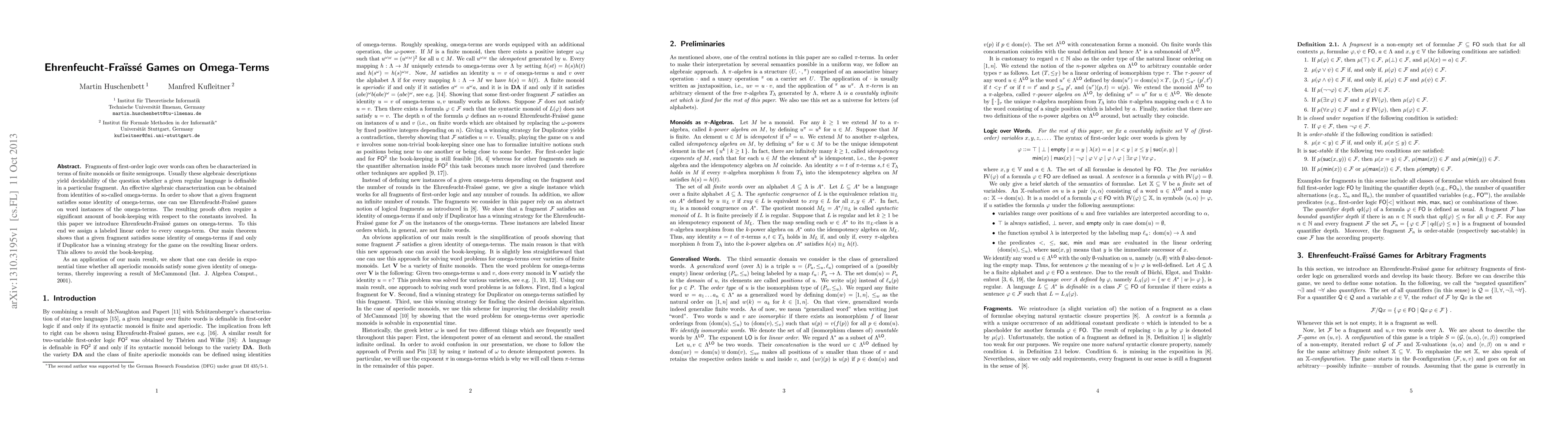 This paper explores the use of Ehrenfeucht-Fraisse games on omega-terms to characterize fragments of first-order logic over words. The authors introduce a labeled linear order for omega-terms, proving that a fragment satisfies an identity if Duplicator wins the game on these orders, thus simplifying the proof process.