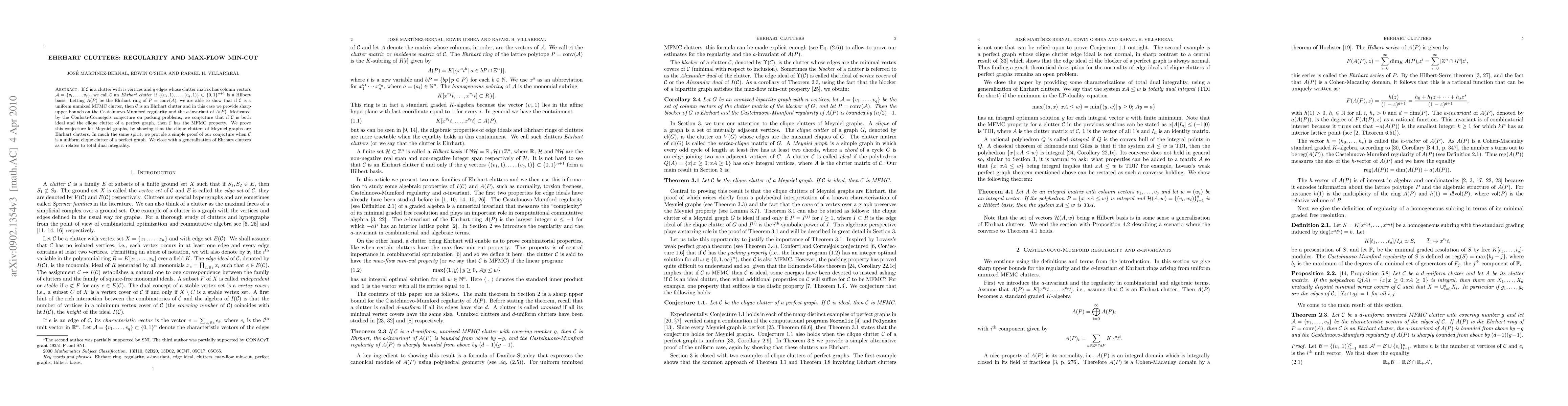If C is a clutter with n vertices and q edges whose clutter matrix has column vectors V={v1,...,vq}, we call C an Ehrhart clutter if {(v1,1),...,(vq,1)} is a Hilbert basis. Letting A(P) be the Ehrhart ring of P=conv(V), we are able to show that if A is the clutter matrix of a uniform, unmixed MFMC clutter C, then C is an Ehrhart clutter and in this case we provide sharp bounds on the Castelnuovo-Mumford regularity of A(P). Motivated by the Conforti-Cornuejols conjecture on packing problems, we conjecture that if C is both ideal and the clique clutter of a perfect graph, then C has the MFMC property. We prove this conjecture for Meyniel graphs, by showing that the clique clutters of Meyniel graphs are Ehrhart clutters. In much the same spirit, we provide a simple proof of our conjecture when C is a uniform clique clutter of a perfect graph. We close with a generalization of Ehrhart clutters as it relates to total dual integrality.