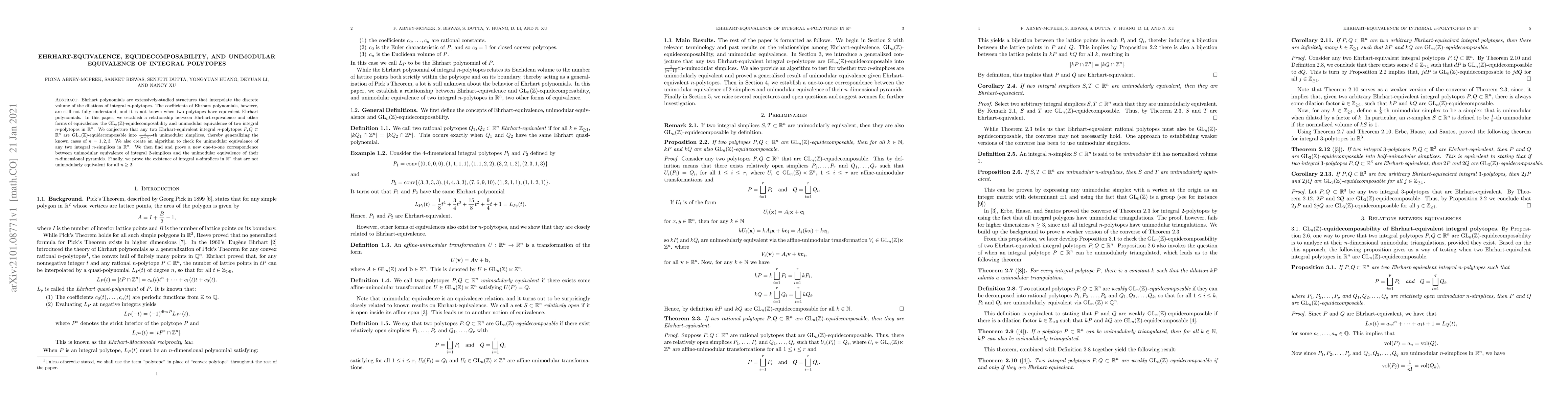 Ehrhart polynomials are extensively-studied structures that interpolate the discrete volume of the dilations of integral $n$-polytopes. The coefficients of Ehrhart polynomials, however, are still not fully understood, and it is not known when two polytopes have equivalent Ehrhart polynomials. In this paper, we establish a relationship between Ehrhart-equivalence and other forms of equivalence: the $\operatorname{GL}_n(\mathbb{Z})$-equidecomposability and unimodular equivalence of two integral $n$-polytopes in $\mathbb{R}^n$. We conjecture that any two Ehrhart-equivalent integral $n$-polytopes $P,Q\subset\mathbb{R}^n$ are $\operatorname{GL}_n(\mathbb{Z})$-equidecomposable into $\frac{1}{(n-1)!}$-th unimodular simplices, thereby generalizing the known cases of $n=1, 2, 3$. We also create an algorithm to check for unimodular equivalence of any two integral $n$-simplices in $\mathbb{R}^n$. We then find and prove a new one-to-one correspondence between unimodular equivalence of integral $2$-simplices and the unimodular equivalence of their $n$-dimensional pyramids. Finally, we prove the existence of integral $n$-simplices in $\mathbb{R}^n$ that are not unimodularly equivalent for all $n \ge 2$.