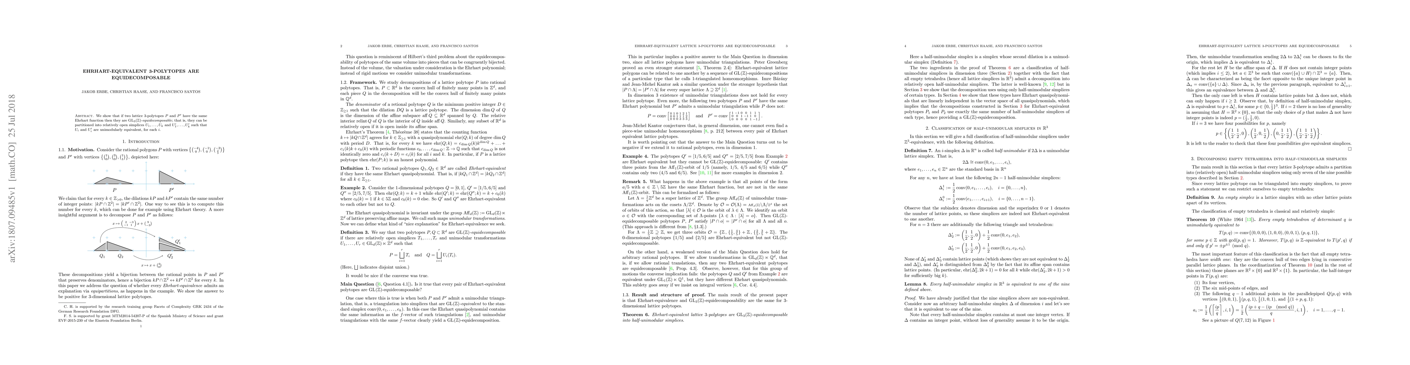 Summary: This paper demonstrates that lattice 3-polytopes with identical Ehrhart functions are $\operatorname{GL}_3({\mathbb Z})$-equidecomposable, meaning they can be dissected into equivalent open simplices through a unimodular transformation.