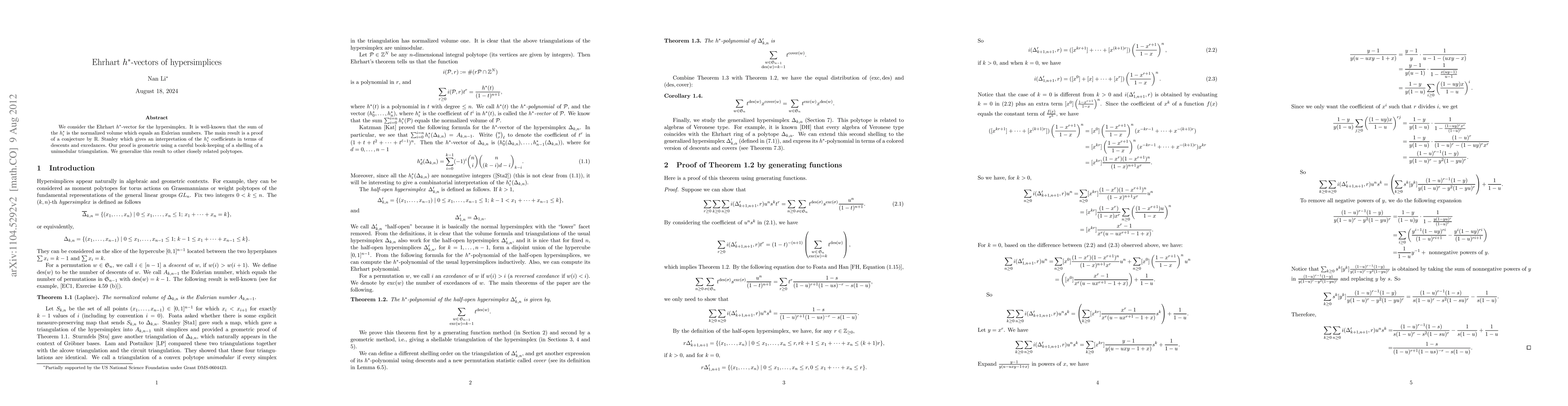 We consider the Ehrhart $h^*$-vector for the hypersimplex. It is well-known that the sum of the $h_i^*$ is the normalized volume which equals an Eulerian numbers. The main result is a proof of a conjecture by R. Stanley which gives an interpretation of the $h^*_i$ coefficients in terms of descents and excedances. Our proof is geometric using a careful book-keeping of a shelling of a unimodular triangulation. We generalize this result to other closely related polytopes.