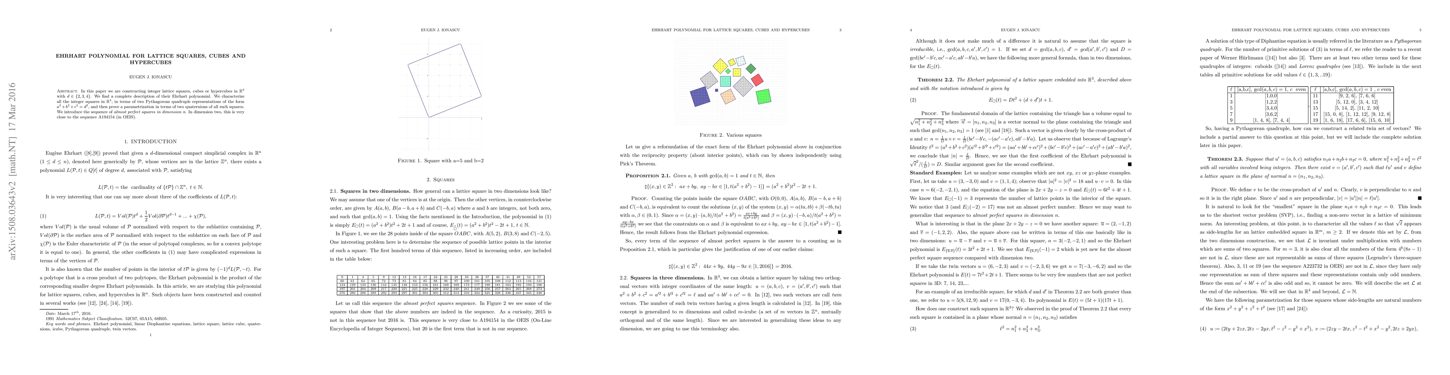 This paper constructs integer lattice squares, cubes, and hypercubes in $\mathbb R^d$ for $d \in \{2,3,4\}$, fully detailing the Ehrhart polynomials for squares and cubes, and proposing a conjecture for the hypercube's polynomial based on computed coefficients.