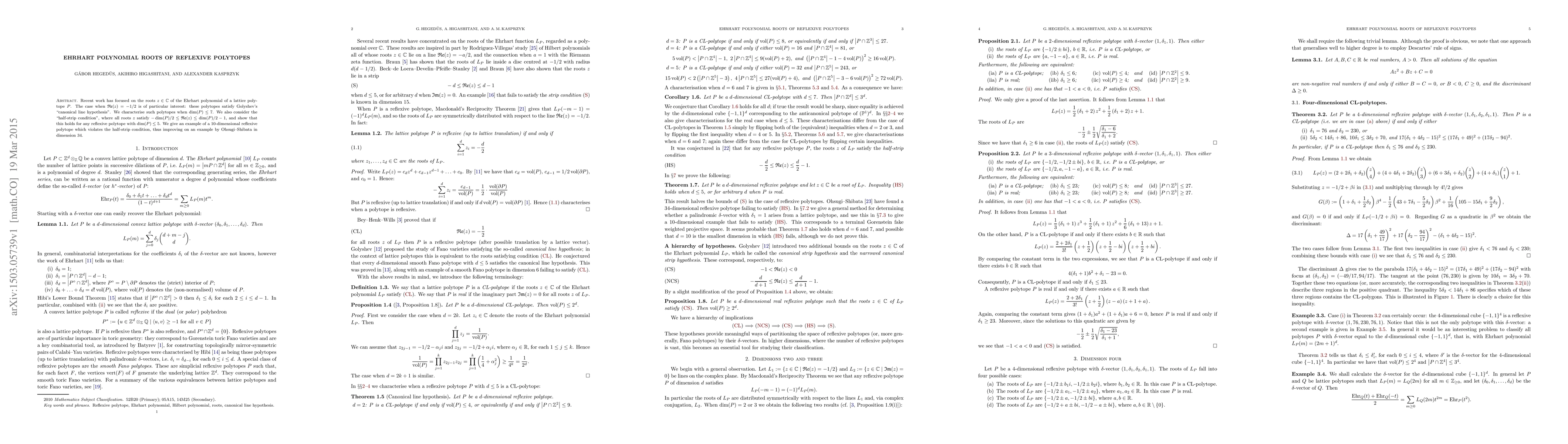 Recent work has focused on the roots z of the Ehrhart polynomial of a lattice polytope P. The case when Re(z) = -1/2 is of particular interest: these polytopes satisfy Golyshev's "canonical line hypothesis". We characterise such polytopes when dim(P) <= 7. We also consider the "half-strip condition", where all roots z satisfy -dim(P)/2 <= Re(z) <= dim(P)/2-1, and show that this holds for any reflexive polytope with dim(P) <= 5. We give an example of a 10-dimensional reflexive polytope which violates the half-strip condition, thus improving on an example by Ohsugi--Shibata in dimension 34.