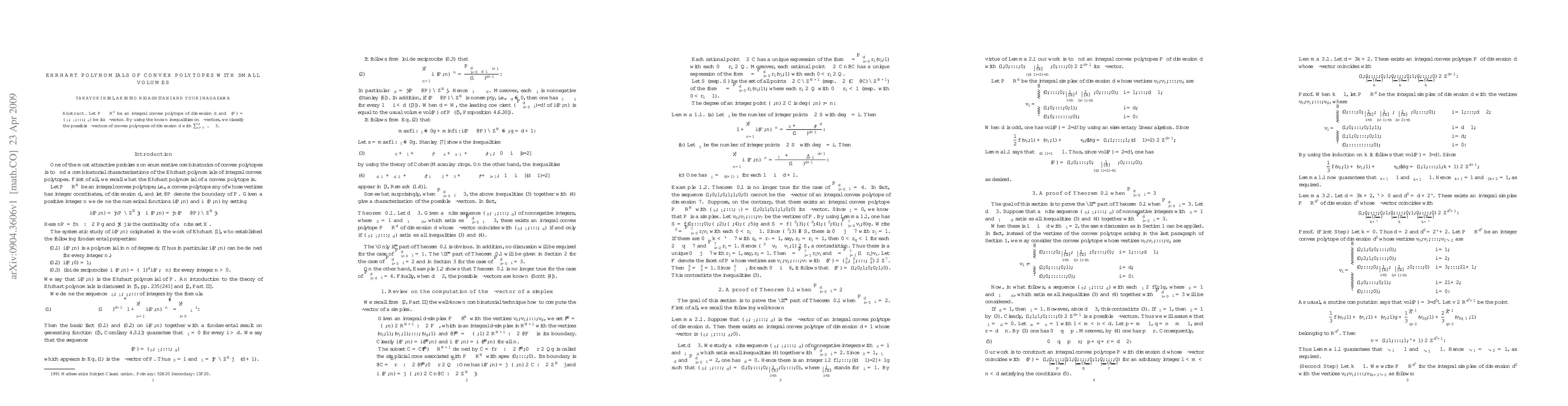 This paper classifies all $delta$-vectors of $d$-dimensional integral convex polytopes with volumes ≤ 3/(d!) and explores the associated Ehrhart polynomials, providing a comprehensive understanding of their structure and properties for small volumes.