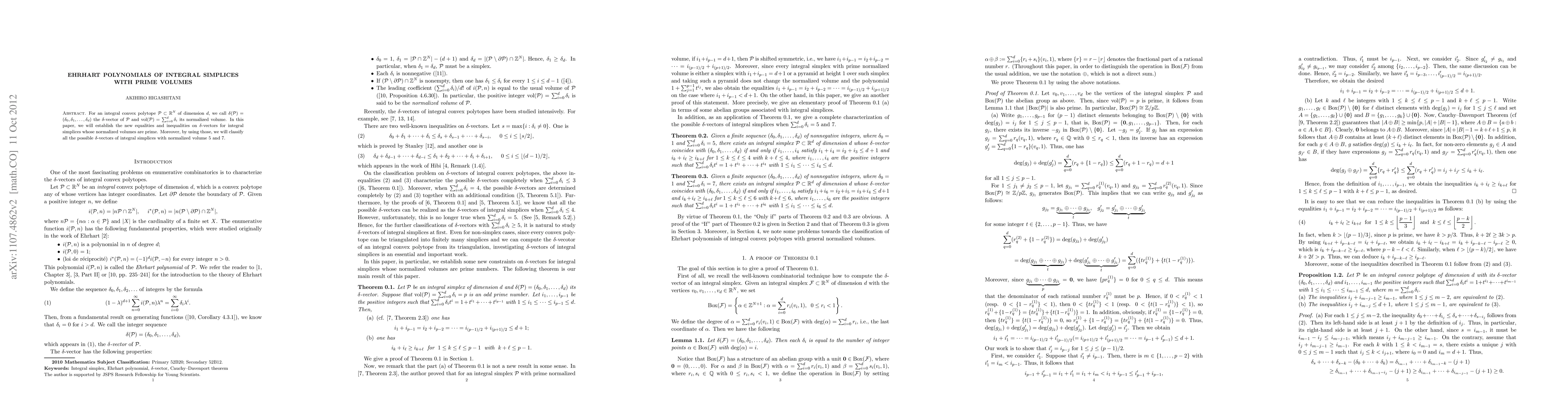 This paper establishes new equalities and inequalities for the $\delta$-vectors of integral simplices with prime normalized volumes, and classifies the $\delta$-vectors for simplices with normalized volumes 5 and 7.