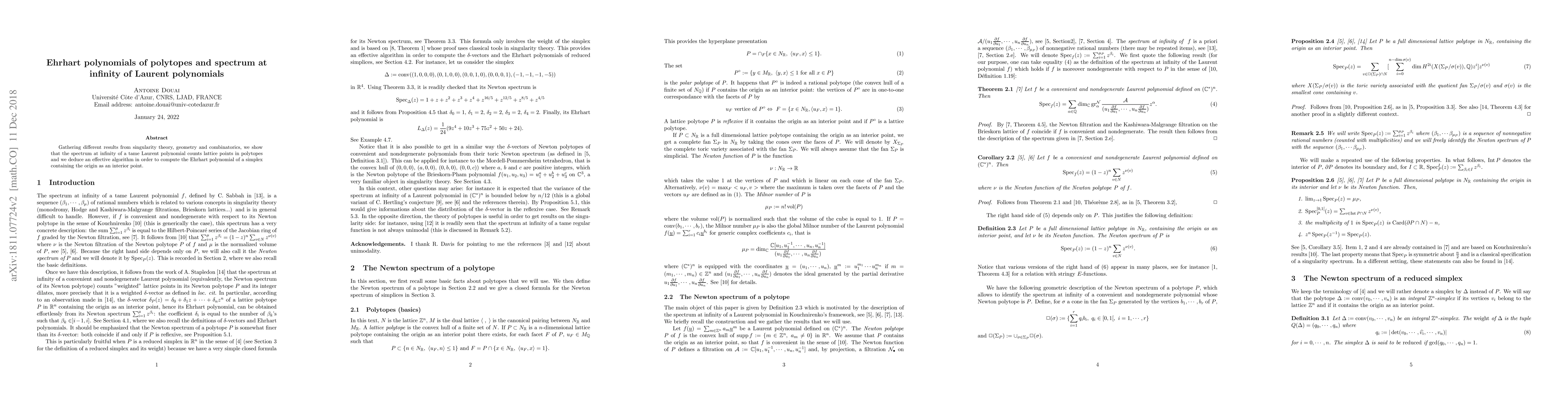 Gathering different results from singularity theory, geometry and combinatorics, we show that the spectrum at infinity of a tame Laurent polynomial counts lattice points in polytopes and we deduce an effective algorithm in order to compute the Ehrhart polynomial of a simplex containing the origin as an interior point.