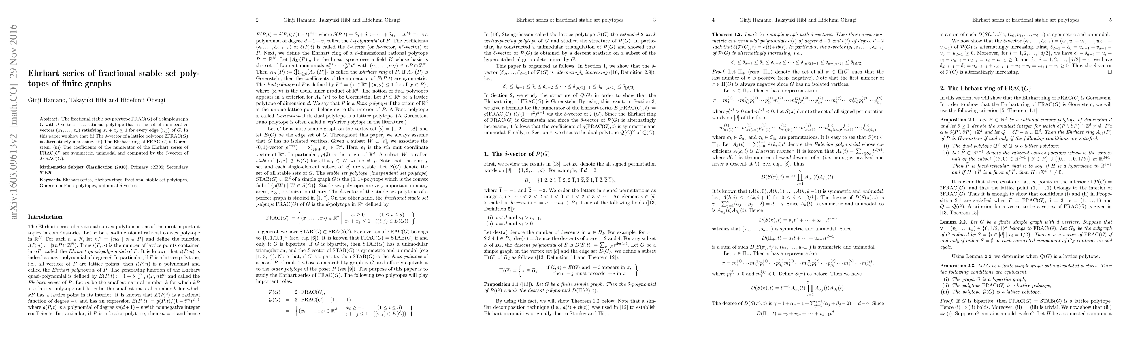 This paper investigates the Ehrhart series of fractional stable set polytopes of finite graphs, demonstrating that the $\delta$-vector of the lattice polytope $2{\rm FRAC}(G)$ is alternatingly increasing, the Ehrhart ring of ${\rm FRAC}(G)$ is Gorenstein, and the coefficients of the numerator of the Ehrhart series of ${\rm FRAC}(G)$ are symmetric, unimodal, and determined by the $\delta$-vector of $2{\rm FRAC}(G)$.