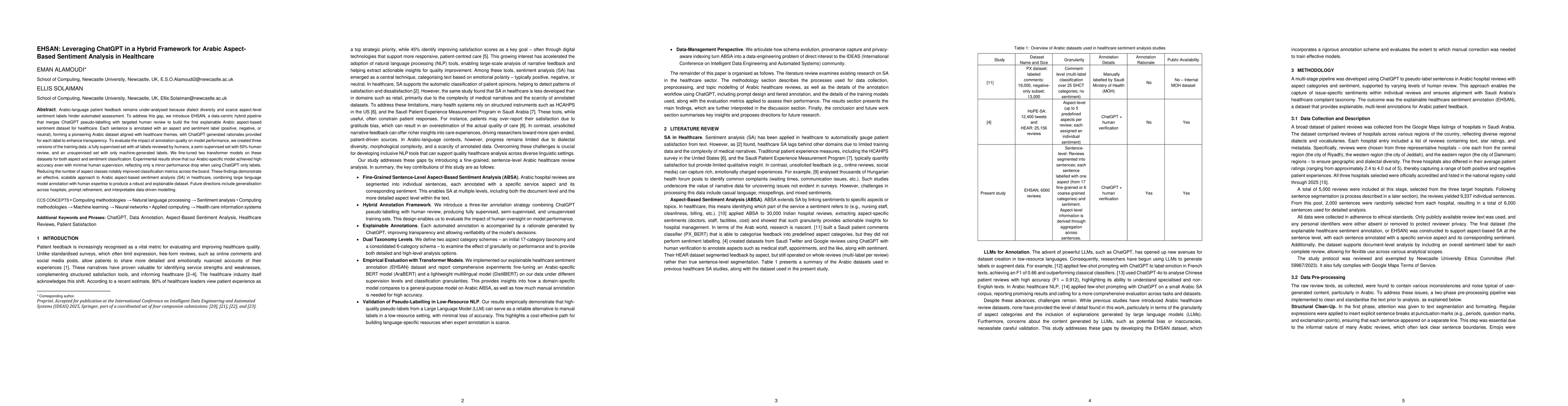 Arabic-language patient feedback remains under-analysed because dialect diversity and scarce aspect-level sentiment labels hinder automated assessment. To address this gap, we introduce EHSAN, a data-centric hybrid pipeline that merges ChatGPT pseudo-labelling with targeted human review to build the first explainable Arabic aspect-based sentiment dataset for healthcare. Each sentence is annotated with an aspect and sentiment label (positive, negative, or neutral), forming a pioneering Arabic dataset aligned with healthcare themes, with ChatGPT-generated rationales provided for each label to enhance transparency. To evaluate the impact of annotation quality on model performance, we created three versions of the training data: a fully supervised set with all labels reviewed by humans, a semi-supervised set with 50% human review, and an unsupervised set with only machine-generated labels. We fine-tuned two transformer models on these datasets for both aspect and sentiment classification. Experimental results show that our Arabic-specific model achieved high accuracy even with minimal human supervision, reflecting only a minor performance drop when using ChatGPT-only labels. Reducing the number of aspect classes notably improved classification metrics across the board. These findings demonstrate an effective, scalable approach to Arabic aspect-based sentiment analysis (SA) in healthcare, combining large language model annotation with human expertise to produce a robust and explainable dataset. Future directions include generalisation across hospitals, prompt refinement, and interpretable data-driven modelling.