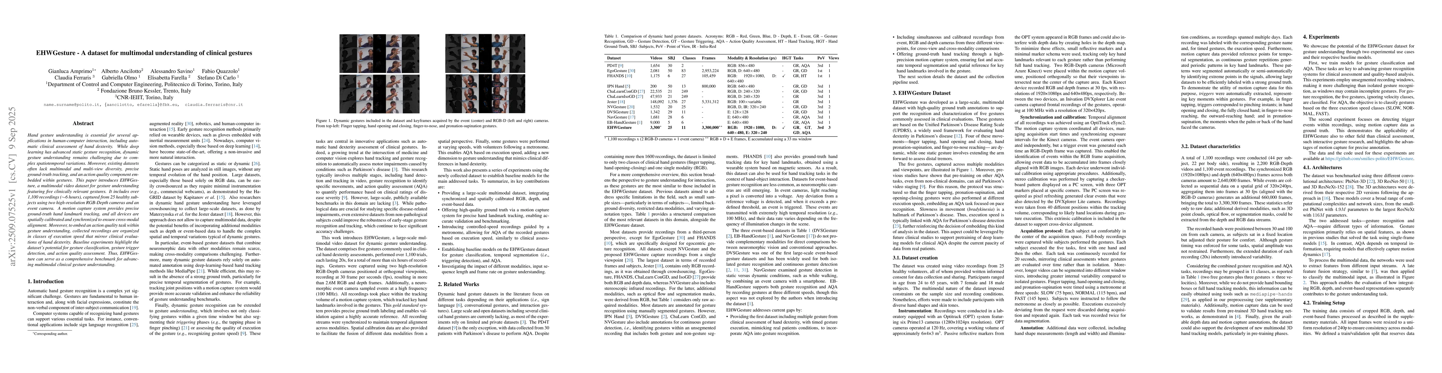 Hand gesture understanding is essential for several applications in human-computer interaction, including automatic clinical assessment of hand dexterity. While deep learning has advanced static gesture recognition, dynamic gesture understanding remains challenging due to complex spatiotemporal variations. Moreover, existing datasets often lack multimodal and multi-view diversity, precise ground-truth tracking, and an action quality component embedded within gestures. This paper introduces EHWGesture, a multimodal video dataset for gesture understanding featuring five clinically relevant gestures. It includes over 1,100 recordings (6 hours), captured from 25 healthy subjects using two high-resolution RGB-Depth cameras and an event camera. A motion capture system provides precise ground-truth hand landmark tracking, and all devices are spatially calibrated and synchronized to ensure cross-modal alignment. Moreover, to embed an action quality task within gesture understanding, collected recordings are organized in classes of execution speed that mirror clinical evaluations of hand dexterity. Baseline experiments highlight the dataset's potential for gesture classification, gesture trigger detection, and action quality assessment. Thus, EHWGesture can serve as a comprehensive benchmark for advancing multimodal clinical gesture understanding.