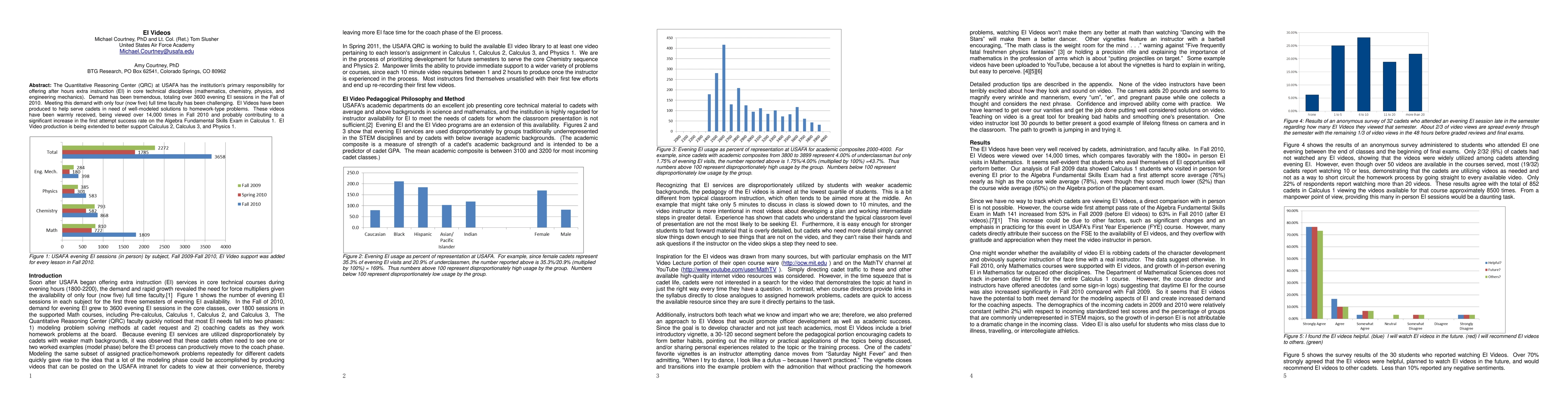 The Quantitative Reasoning Center at USAFA uses EI Videos to provide extra instruction in core technical subjects, meeting high demand and significantly boosting success rates on foundational exams. These videos, viewed over 14,000 times in Fall 2010, are now being expanded to cover additional advanced courses.