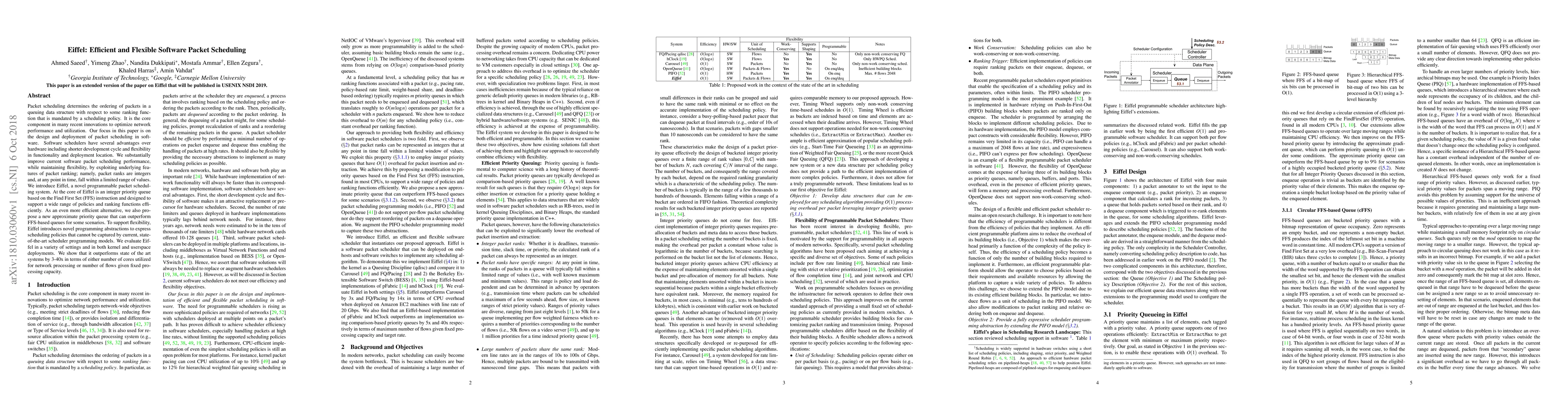 This paper introduces Eiffel, a novel software packet scheduling system designed to improve network performance and utilization. It leverages integer priority queues and introduces flexible programming abstractions to outperform existing systems by 3-40x in various metrics.