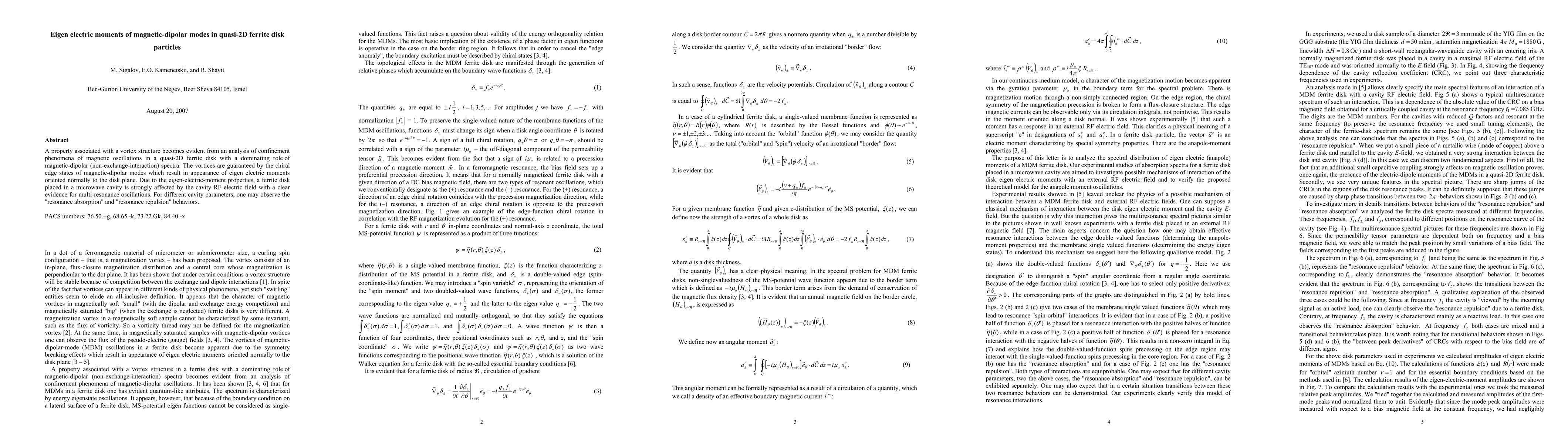 This paper investigates the magnetic-dipolar modes in quasi-2D ferrite disk particles, revealing eigen electric moments from chiral edge states that lead to multi-resonance oscillations when placed in a microwave cavity, exhibiting both "resonance absorption" and "resonance repulsion" behaviors.