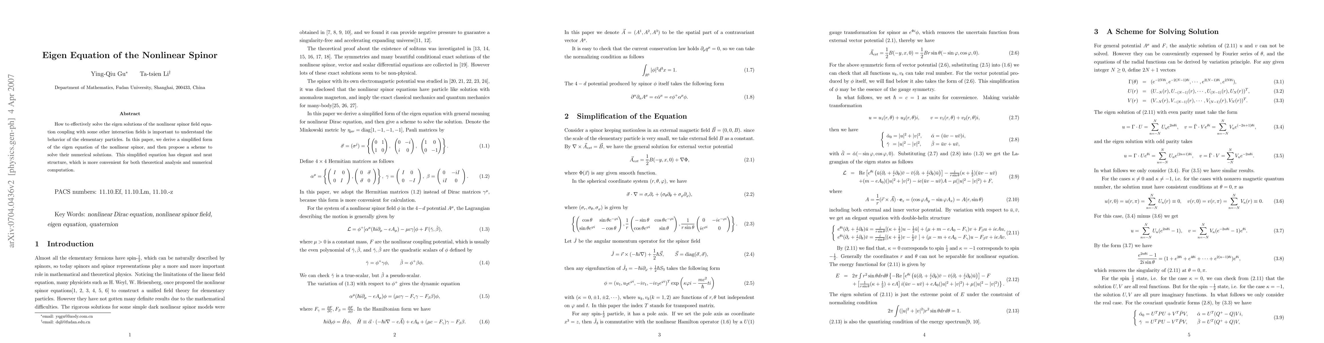 How to effectively solve the eigen solutions of the nonlinear spinor field equation coupling with some other interaction fields is important to understand the behavior of the elementary particles. In this paper, we derive a simplified form of the eigen equation of the nonlinear spinor, and then propose a scheme to solve their numerical solutions. This simplified equation has elegant and neat structure, which is more convenient for both theoretical analysis and numerical computation.
